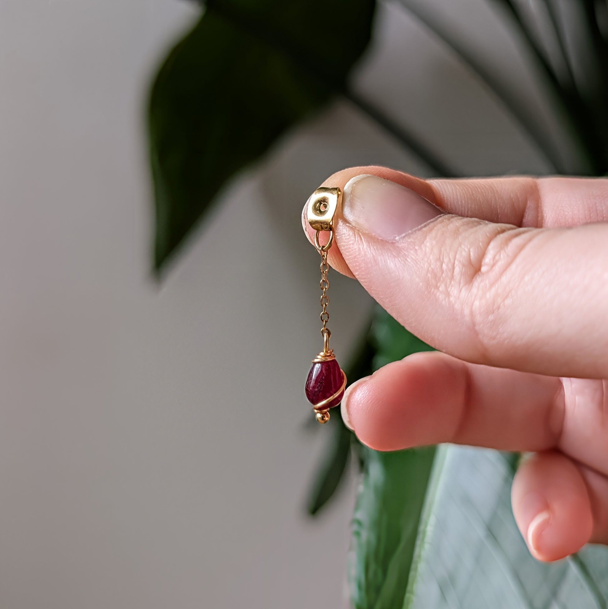 Zwei zarte Fledermäuse aus Edelstahl für eine Ohren – wahlweise solo oder mit tiefroten Chalzedontropfen, die wie Blutperlen an der Nacht hängen. Die Edelsteinanhänger sind abnehmbar und lassen sich ganz nach Stimmung oder Anlass tragen. Ein wandelbares Schmuckstück zwischen düsterer Romantik und subtiler Eleganz – perfekt für mondhelle Nächte, Halloween oder einfach den Alltag mit einem Hauch Magie.