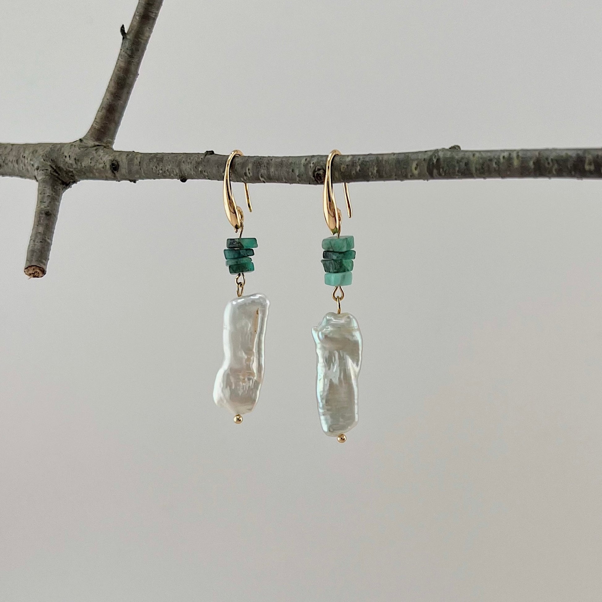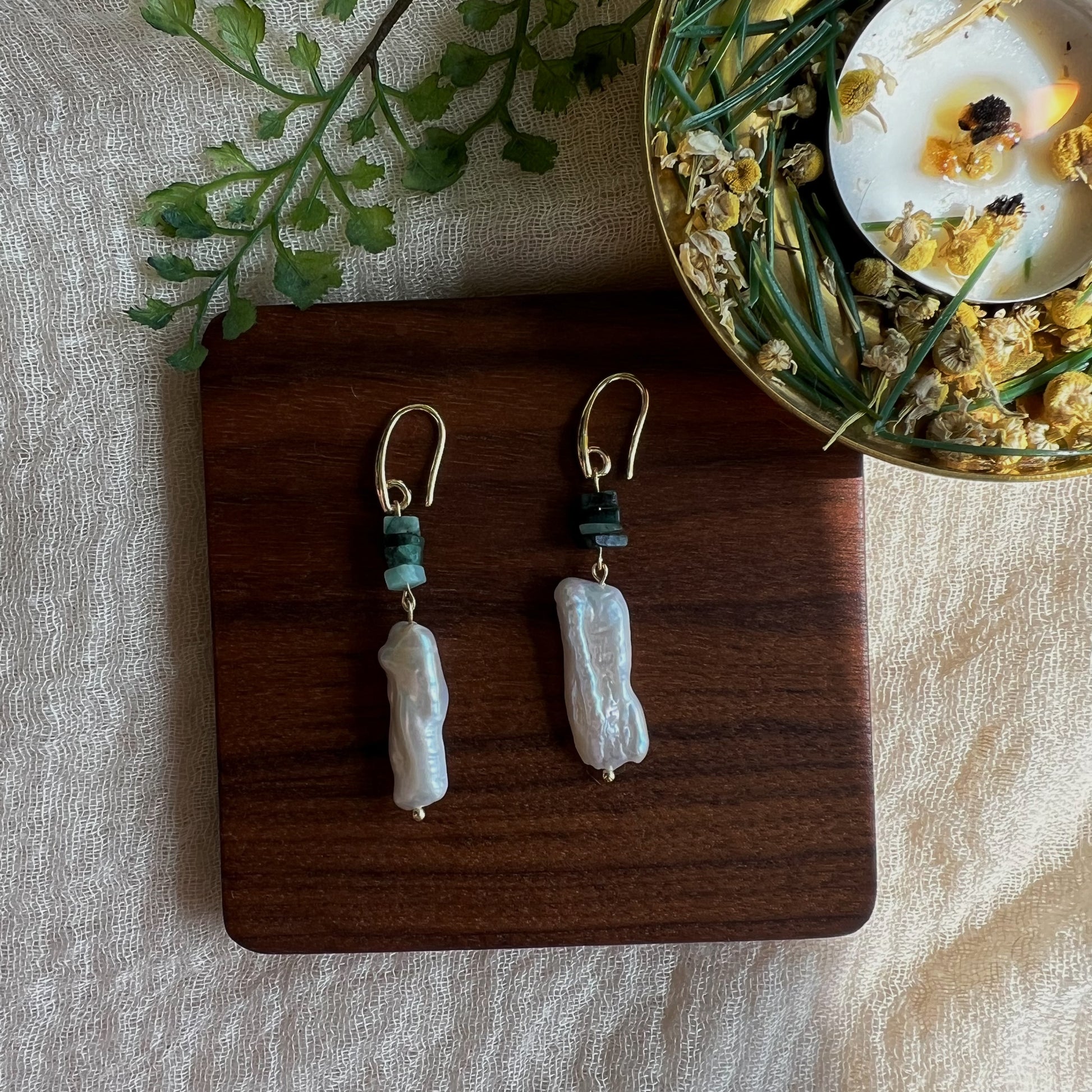 Diese handgefertigten Ohrringe aus Messing verkörpern die Harmonie von Wald und Wasser. Die großen, unregelmäßig geformten Süßwasserperlen, die das Licht wie sanfte Wellen einfangen, verleihen jedem Paar eine einzigartige Ausstrahlung. Die viereckigen, kleinen Smaragdsteine darüber erinnern an die tiefen, satten Grüntöne des Waldes und ergänzen das Design perfekt.
