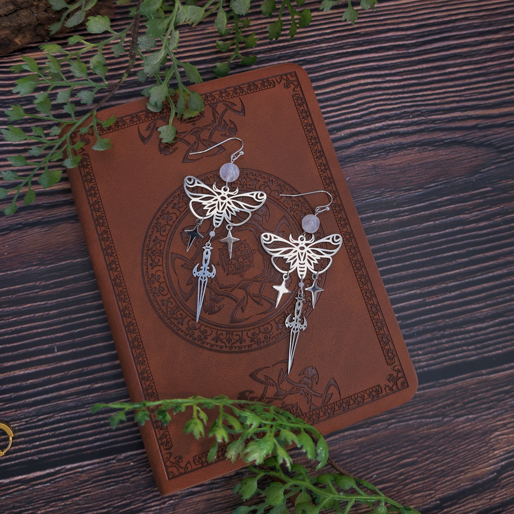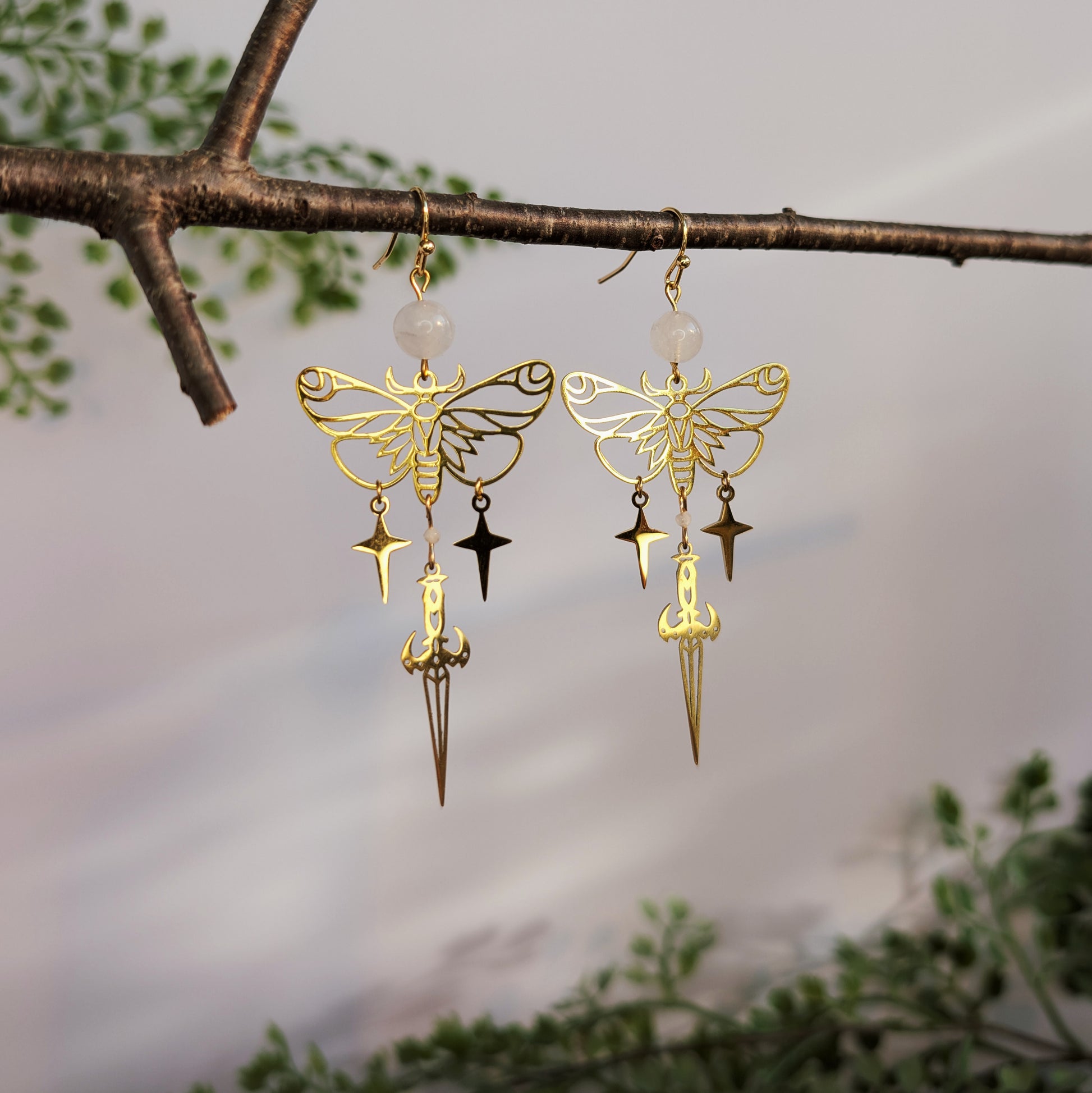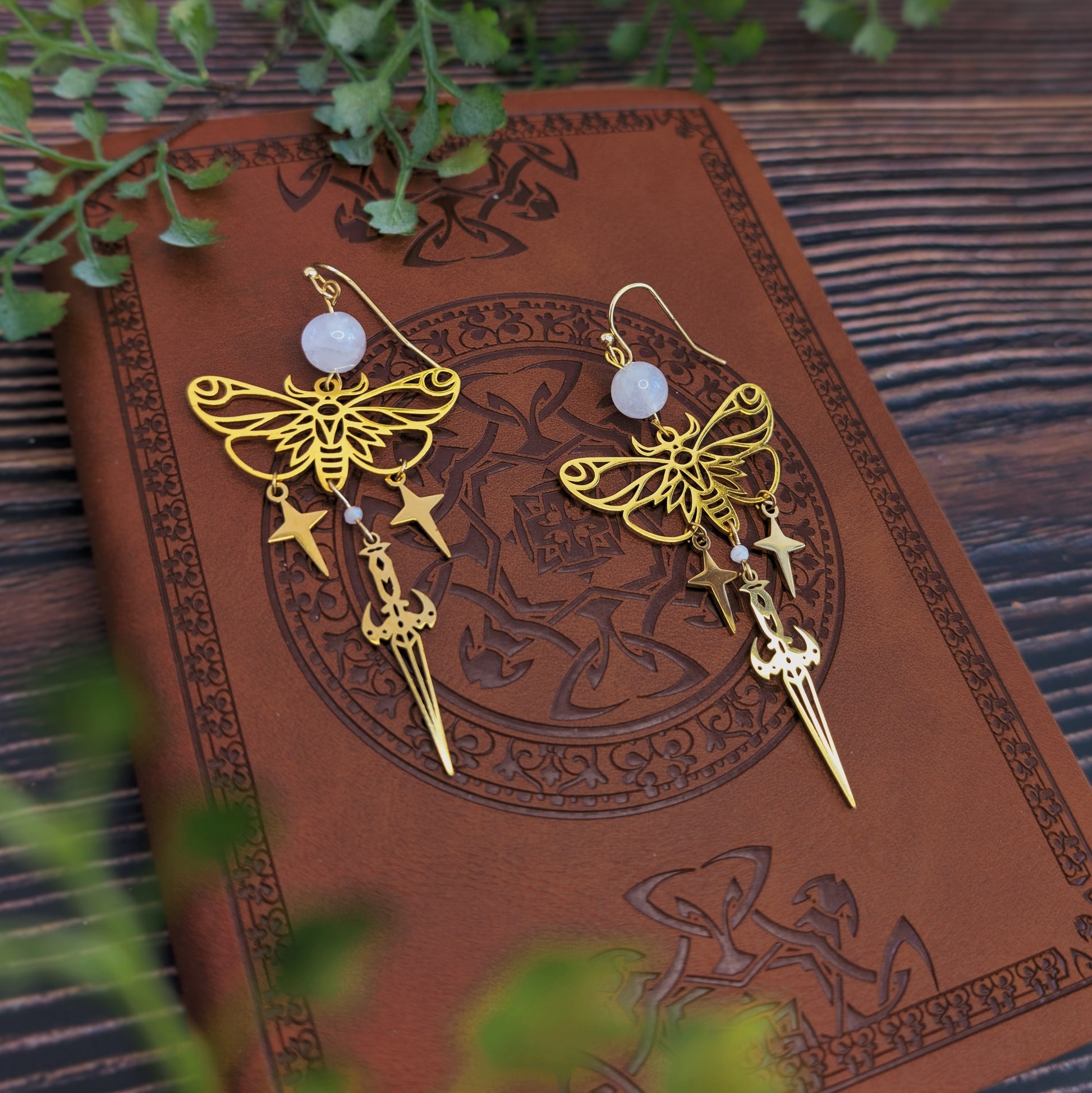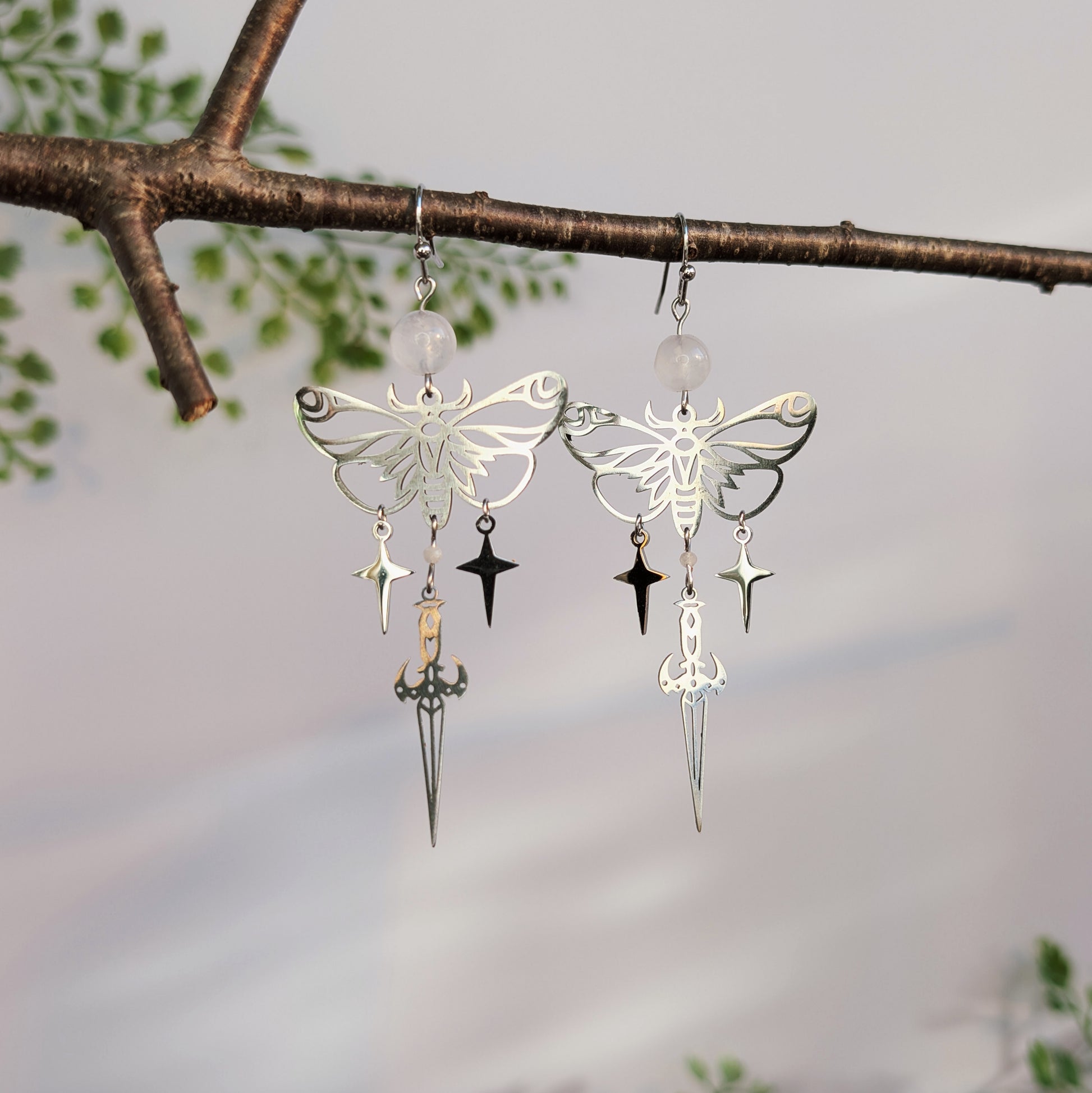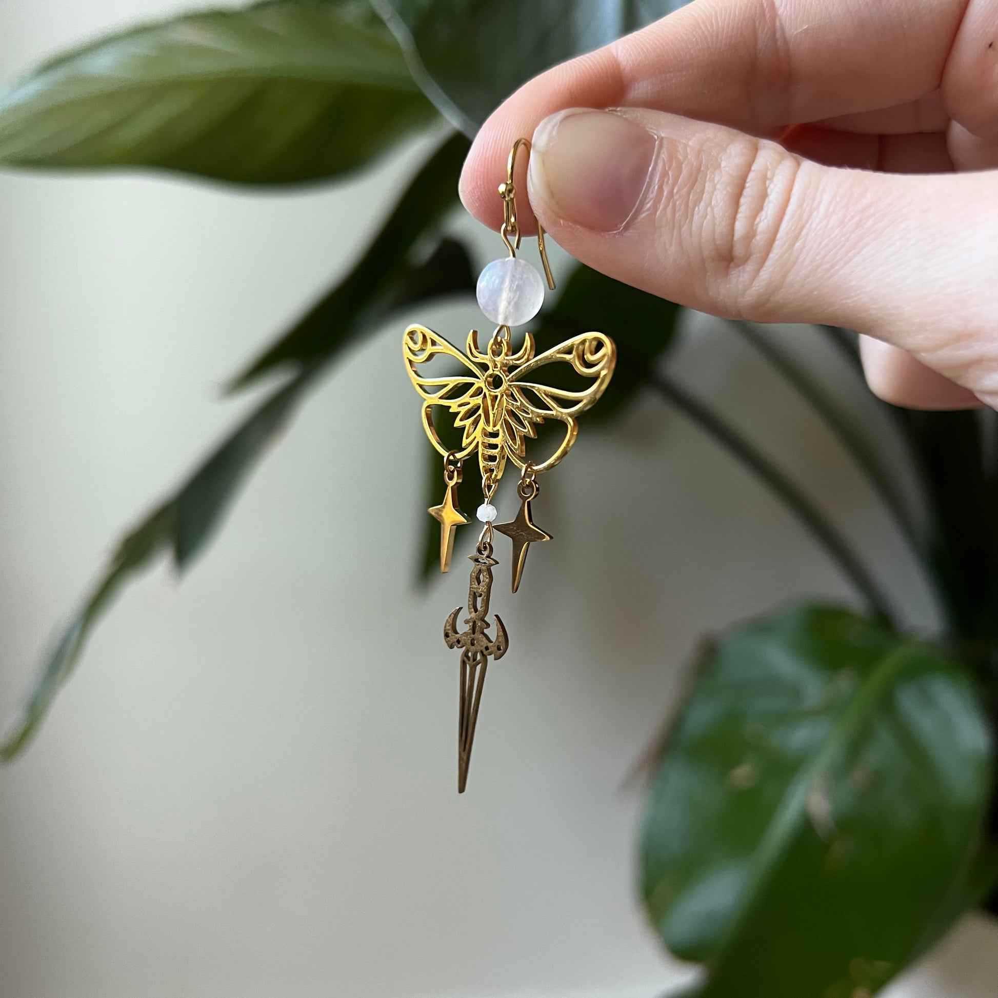Filigrane Ohrhänger mit einem detailreichen Mottenmotiv, kombiniert mit frei schwingenden Stern- und Dolch-Elementen. Über dem Motiv sitzt eine runde Mondstein-Perle, die dem Design eine besondere Note verleiht.