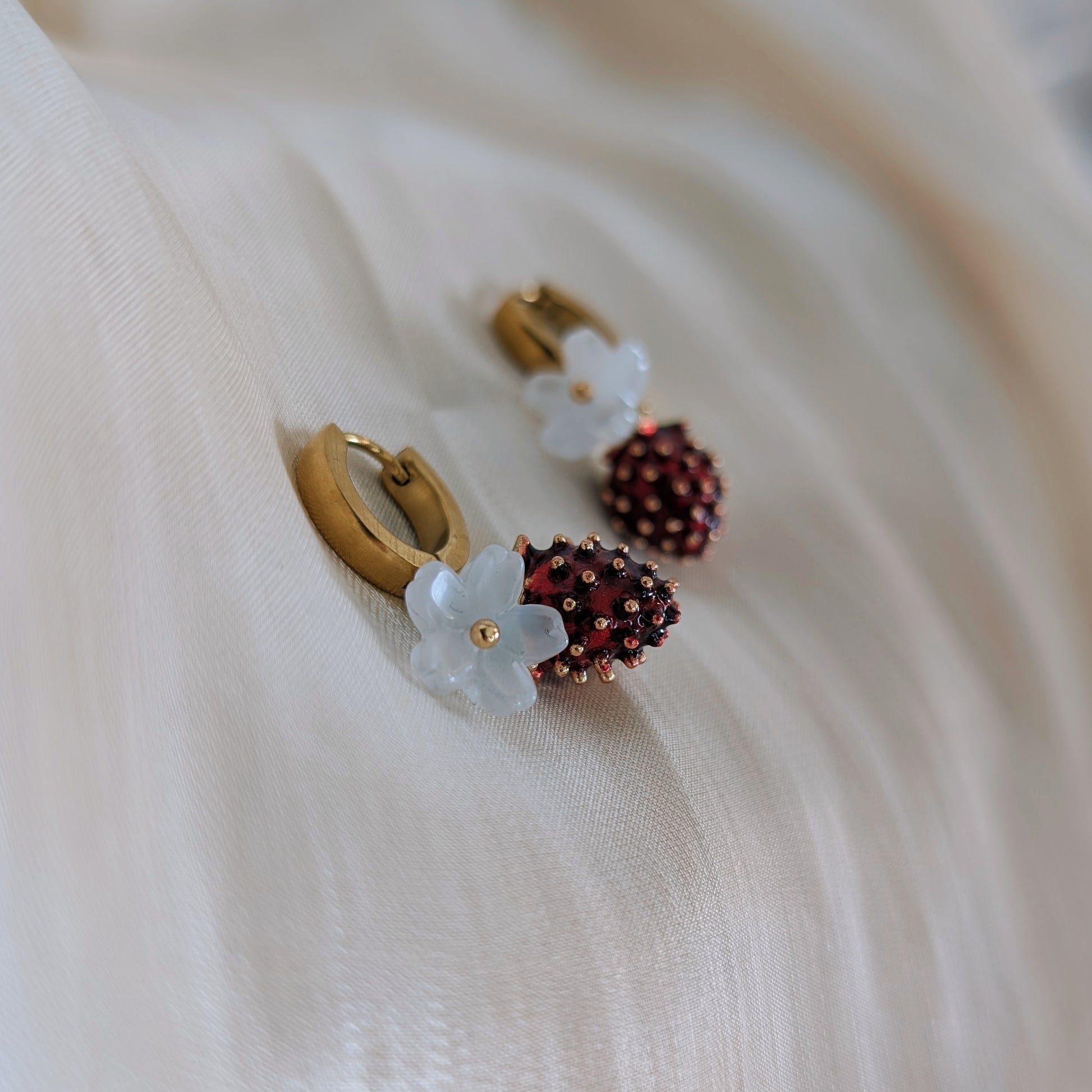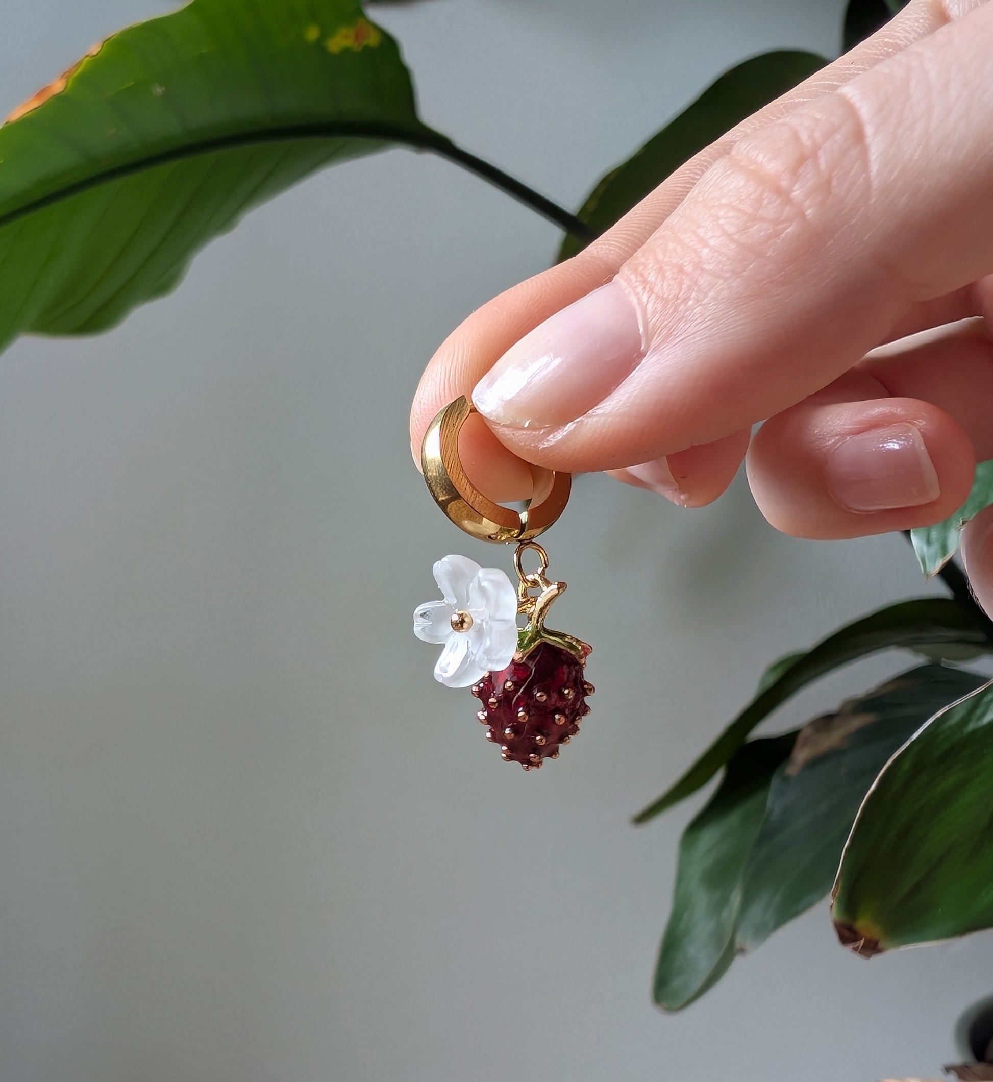 Diese Ohrringe bringen einen Hauch von Märchenwald in deinen Alltag. An feinen Edelstahlcreolen tanzen Emaille-Erdbeeren und eine kleine weiße Blüte – wie frisch gepflückt aus einem verwunschenen Garten. Perfekt für Tage, an denen du barfuß durch weiches Gras laufen oder einfach etwas Magie bei dir tragen möchtest.