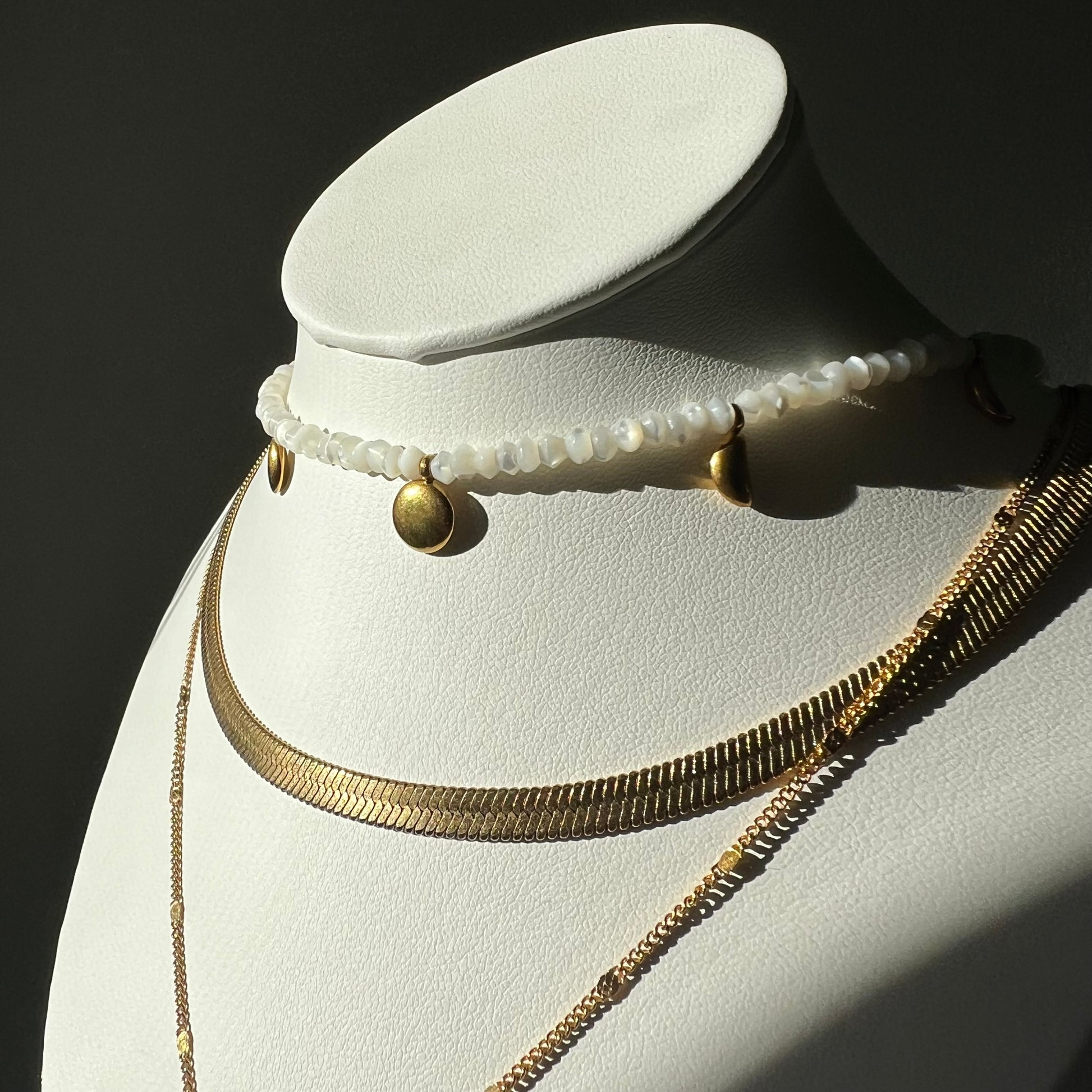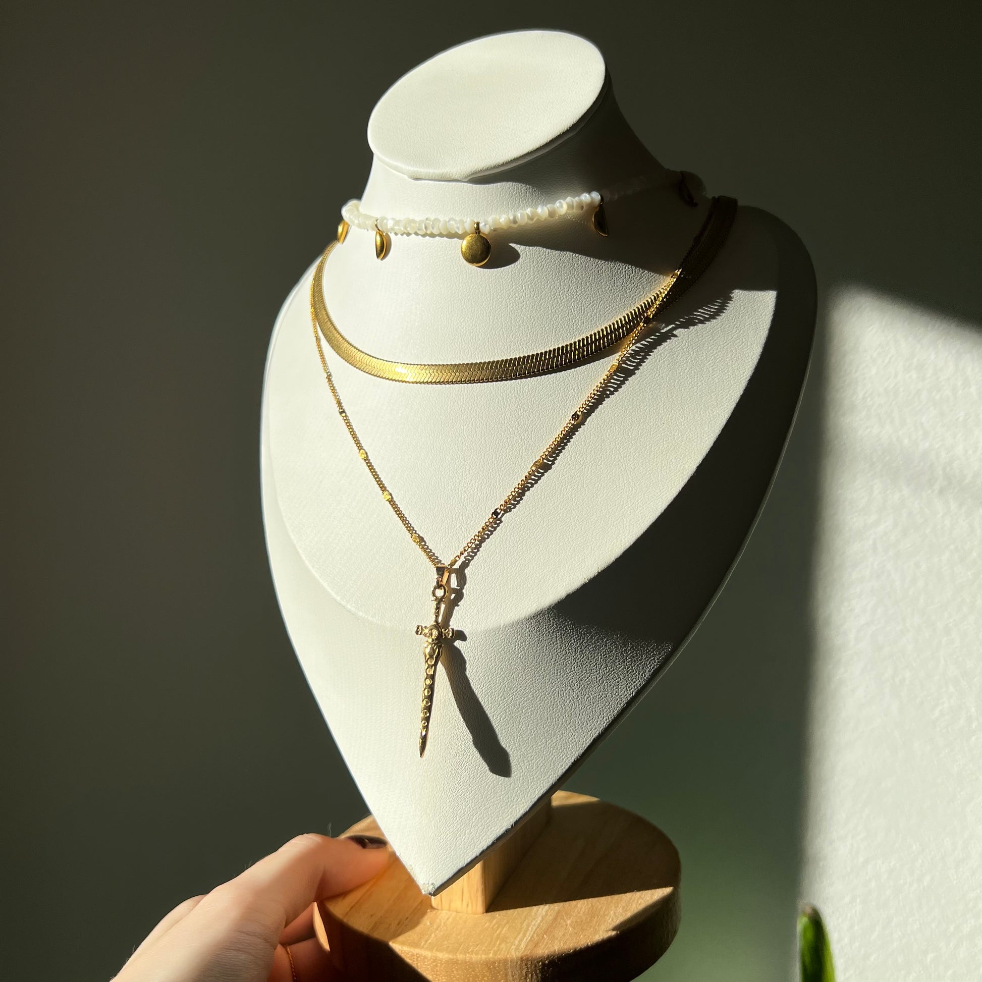Eine feine Kette mit Schwertanhänger, eine glatte Schlangen-Halskette und eine Perlmuttkette mit kleinen Mondphasen-Anhängern.