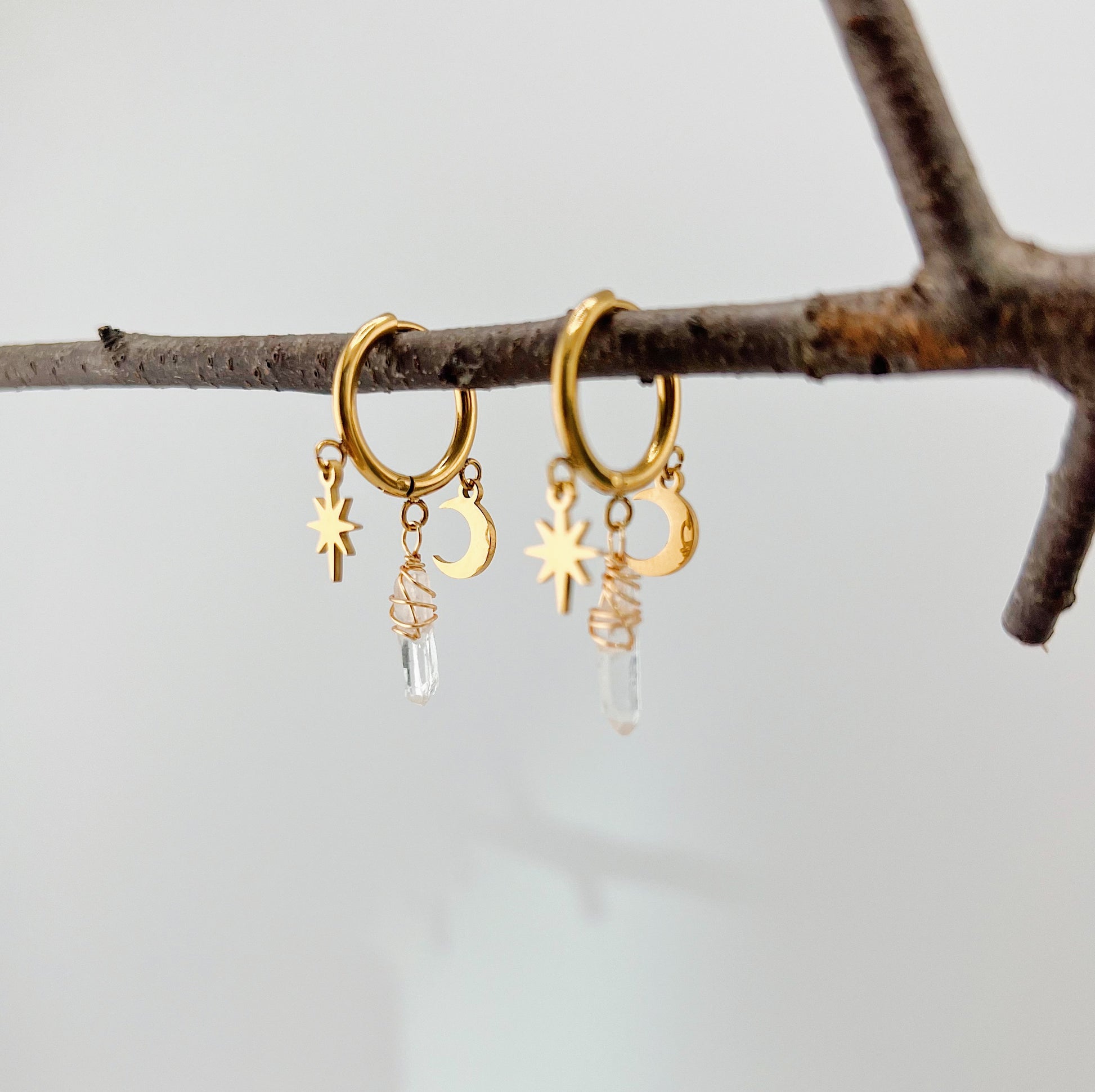 Diese Creolen vereinen himmlische und erdverbundene Elemente in einem einzigartigen Design: Ein filigraner Stern, ein sanft schimmernder Mond und ein klarer Bergkristall schmücken die zeitlosen Edelstahl-Creolen. Der Stern steht für Hoffnung, der Mond für Intuition und der Bergkristall für Klarheit ein Schmuckstück, das die Magie des Universums einfängt und dich strahlen lässt.