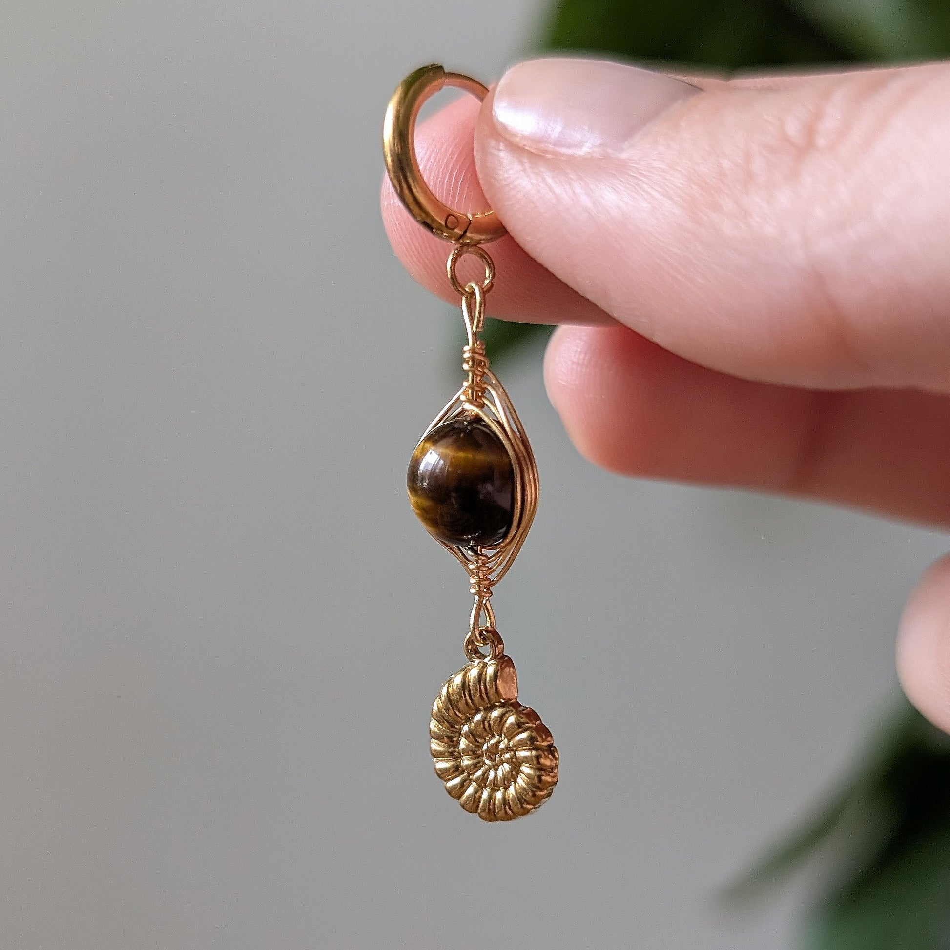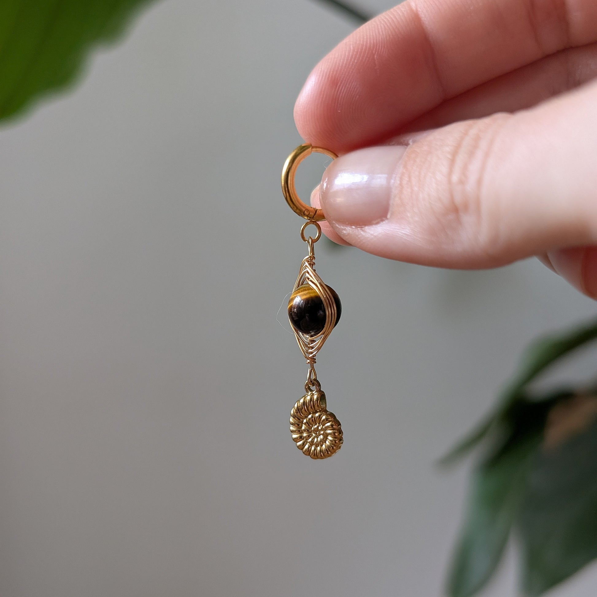 Ein Schmuckstück wie aus einem vergessenen Sonnenreich: warmer Glanz, ein schimmerndes Tigerauge – wie die Bernsteinaugen einer Waldkatze – und ein filigraner Ammonit-Anhänger, der an die uralten Spiralen der Erde erinnert.