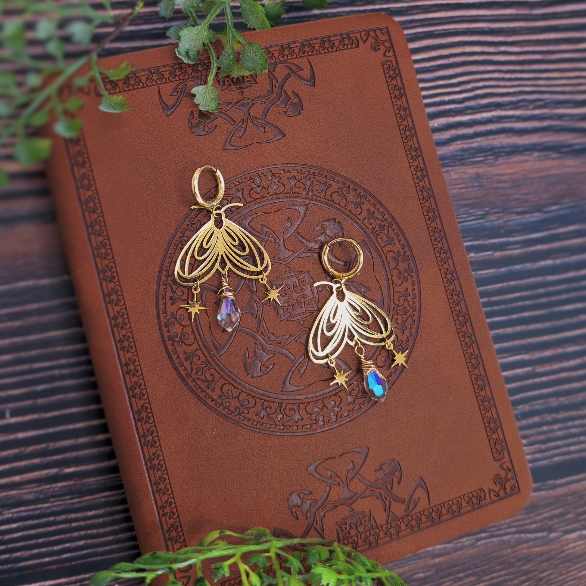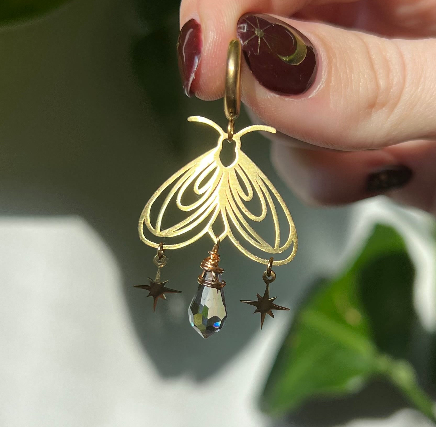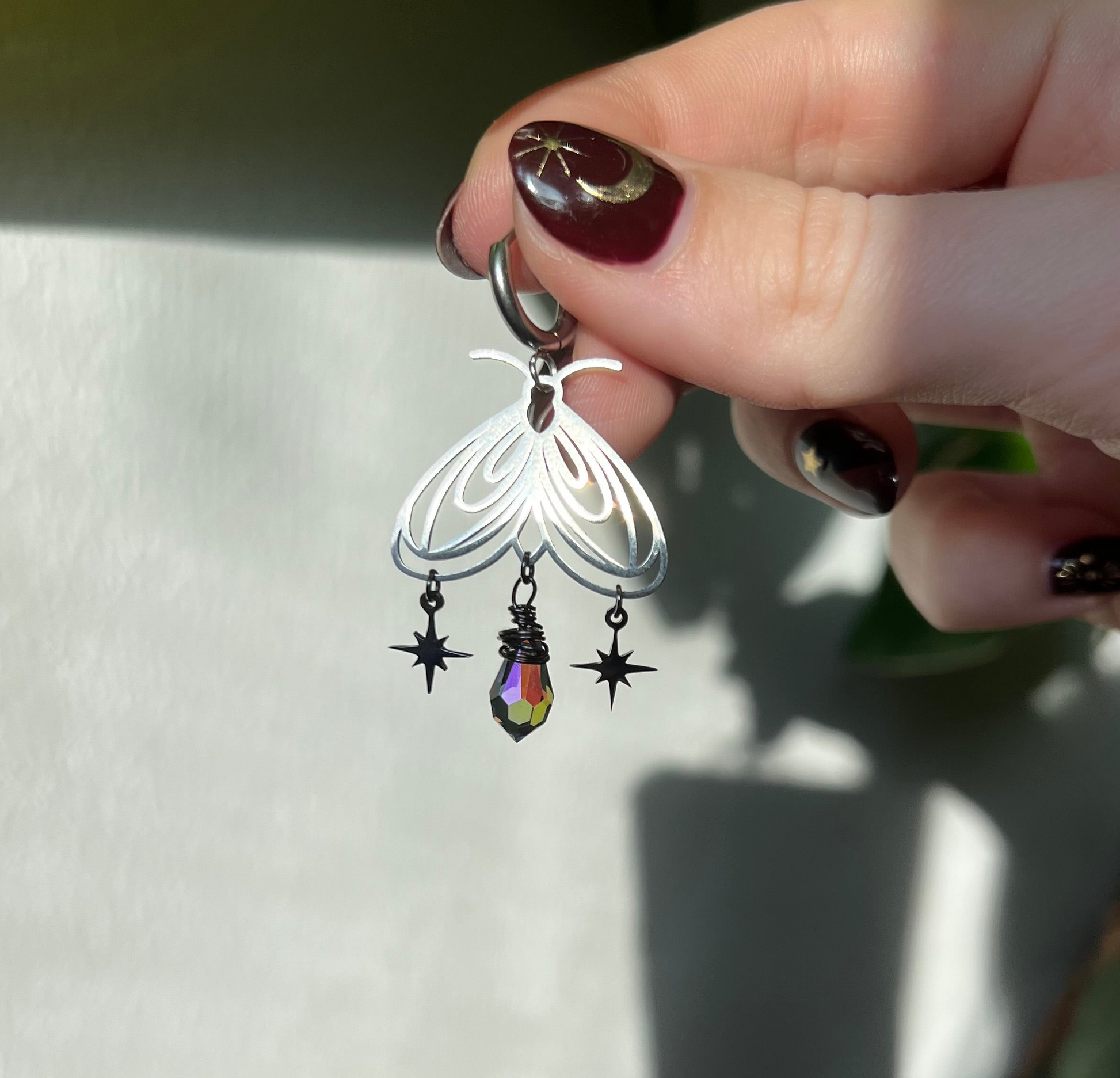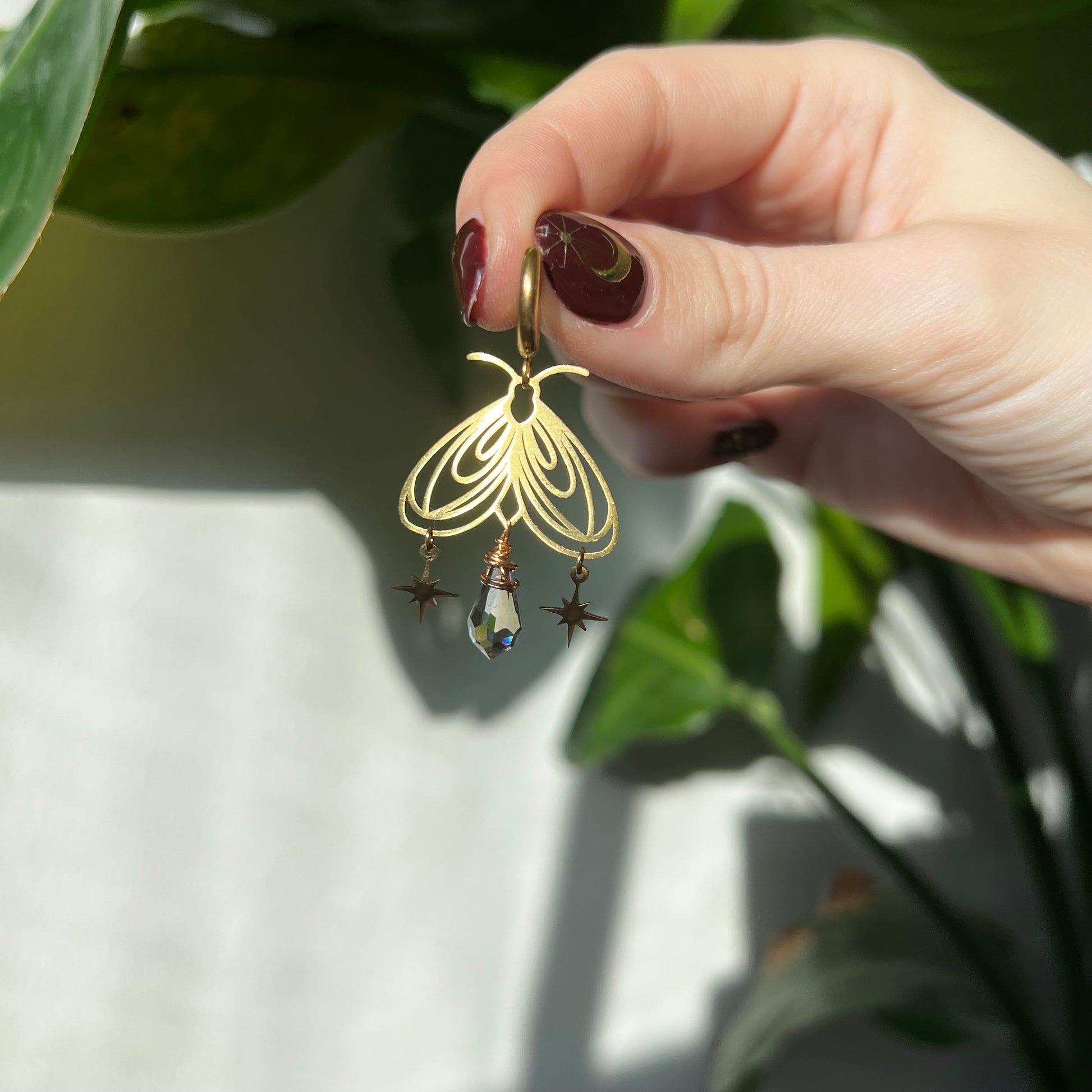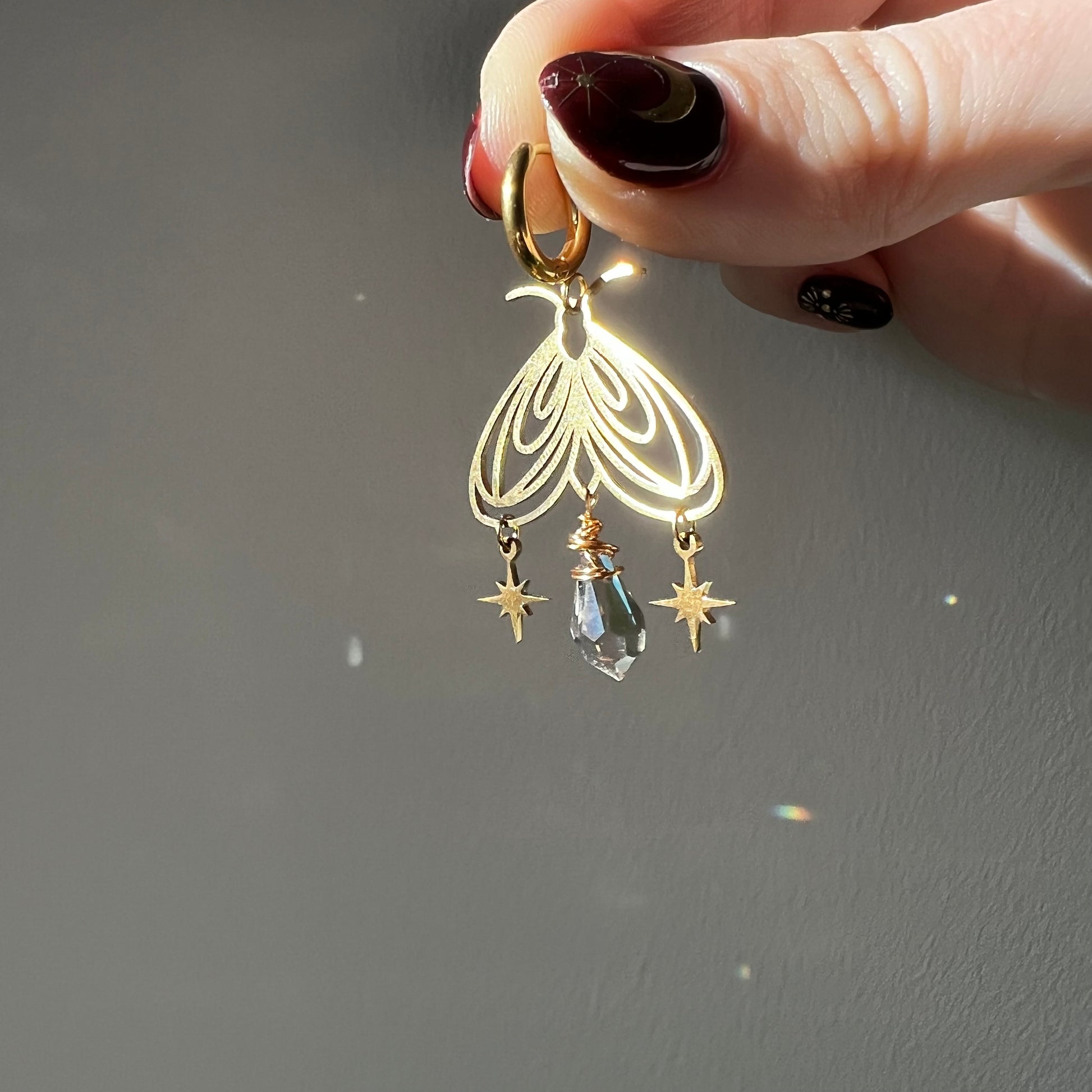 Zarte Mottenohrringe, die im Licht sanft schimmern. Die filigrane Form wird von einer kleinen Glasperle ergänzt, die wie ein Suncatcher glitzert. Zwei kleine Sterne bringen Bewegung und einen feinen, märchenhaften Akzent.