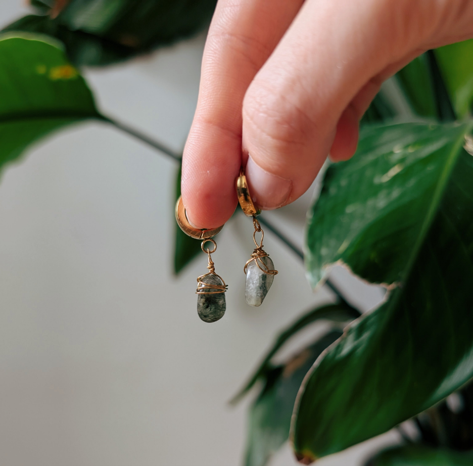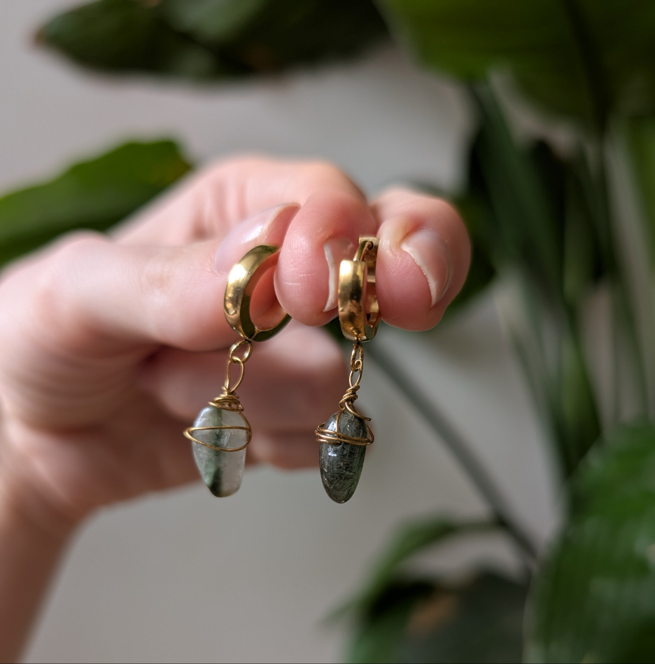 Jedes Paar ist ein Unikat – mit liebevoll gewickeltem Rutilquarz oder Labradorit, in denen sich das Sonnenlicht faszinierend bricht.