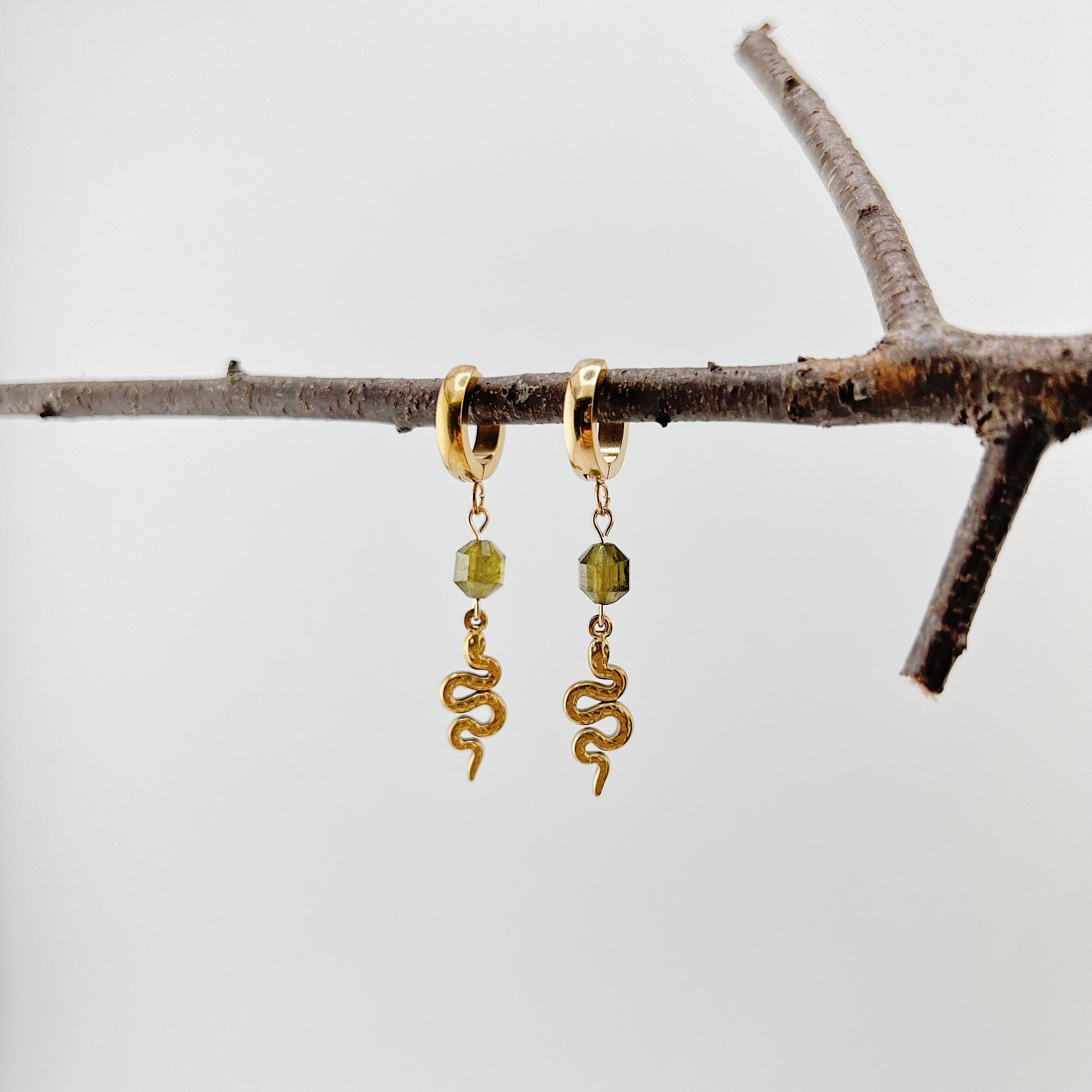 Diese Edelstahl-Creolen vereinen facettierte Tsavorit-Perlen, eine leuchtend grüne Variation des Granats, mit eleganten Schlangenanhängern. Die Kombination aus der natürlichen Brillanz der Steine und der symbolischen Kraft der Schlange macht diese Ohrringe zu einem ausdrucksstarken Accessoire für einen einzigartigen Look.