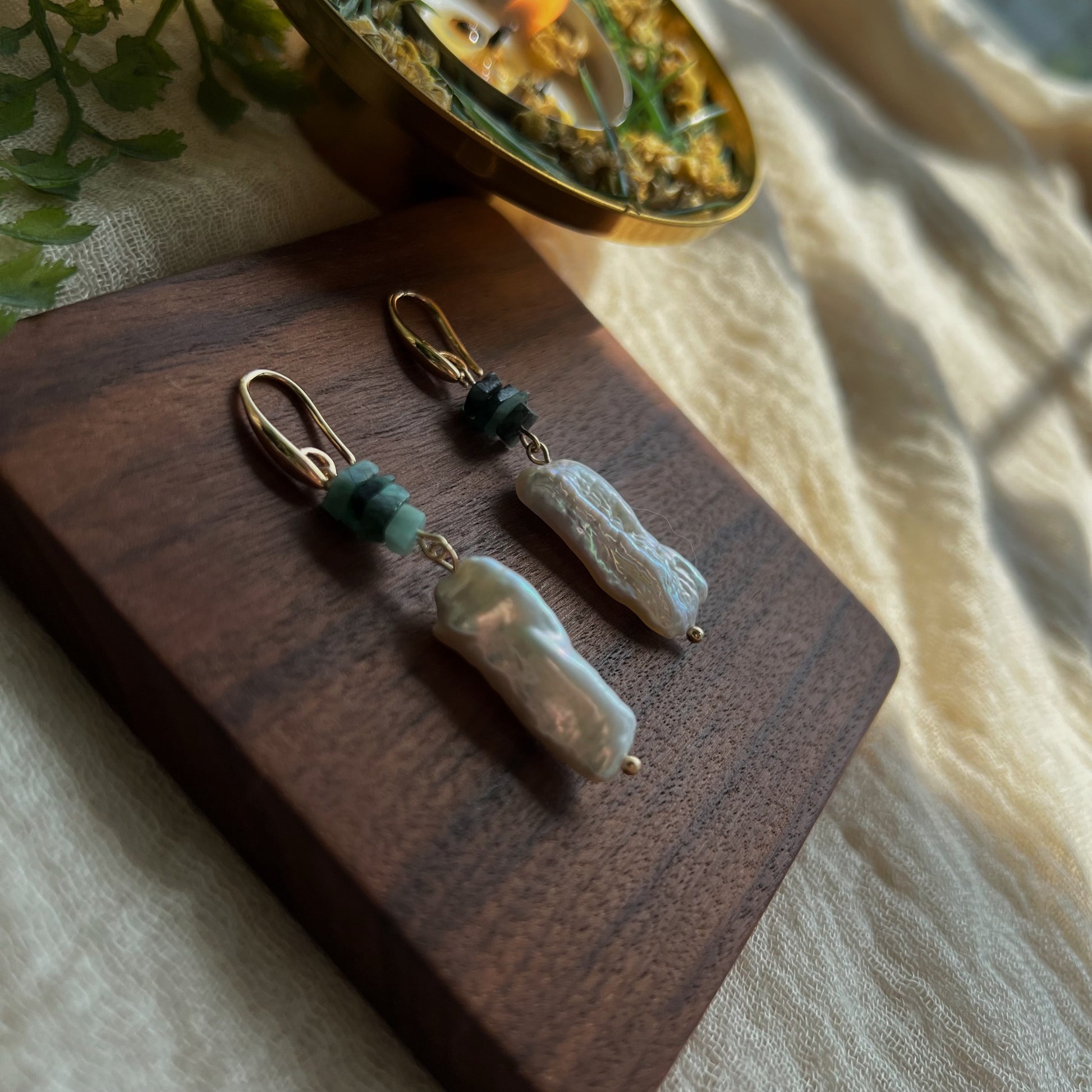 Diese handgefertigten Ohrringe aus Messing verkörpern die Harmonie von Wald und Wasser. Die großen, unregelmäßig geformten Süßwasserperlen, die das Licht wie sanfte Wellen einfangen, verleihen jedem Paar eine einzigartige Ausstrahlung. Die viereckigen, kleinen Smaragdsteine darüber erinnern an die tiefen, satten Grüntöne des Waldes und ergänzen das Design perfekt.