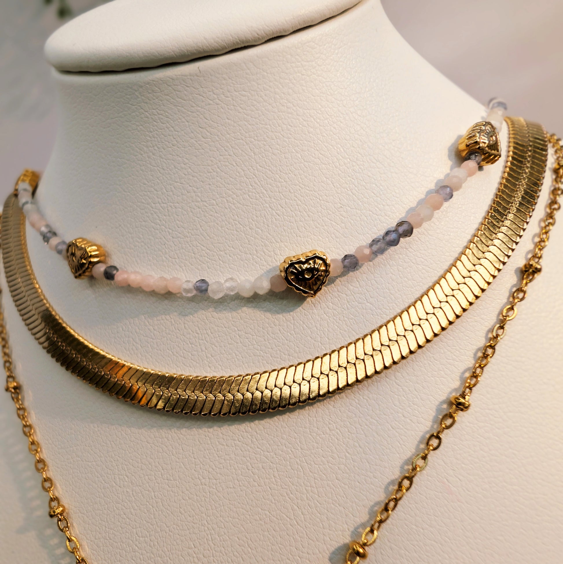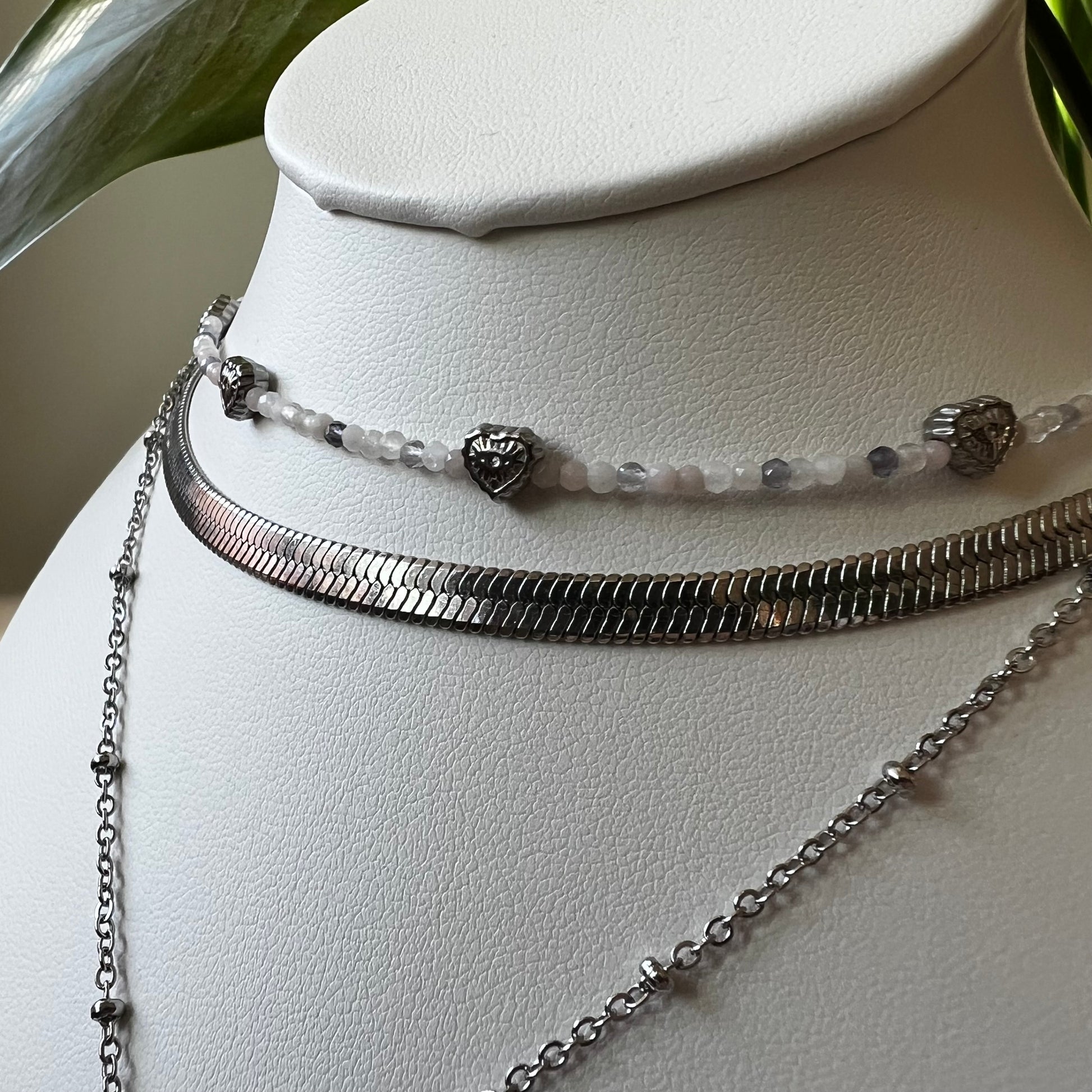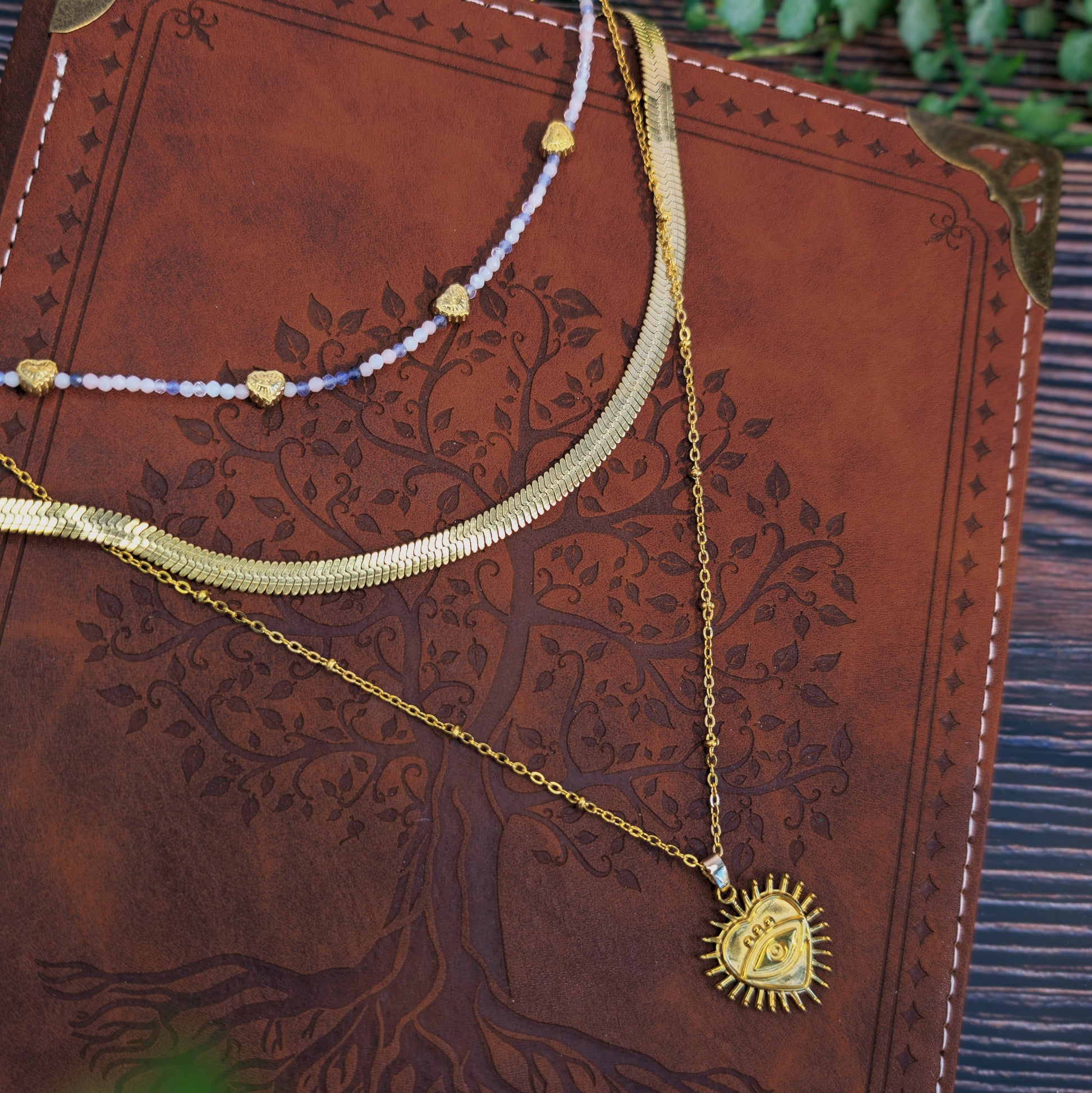 Eine feine Kette mit Augenanhänger in Herzform, eine glatte Schlangen-Halskette und eine Edelsteinkette mit kleinen Herz-Augen-Perlen aus Edelstahl.