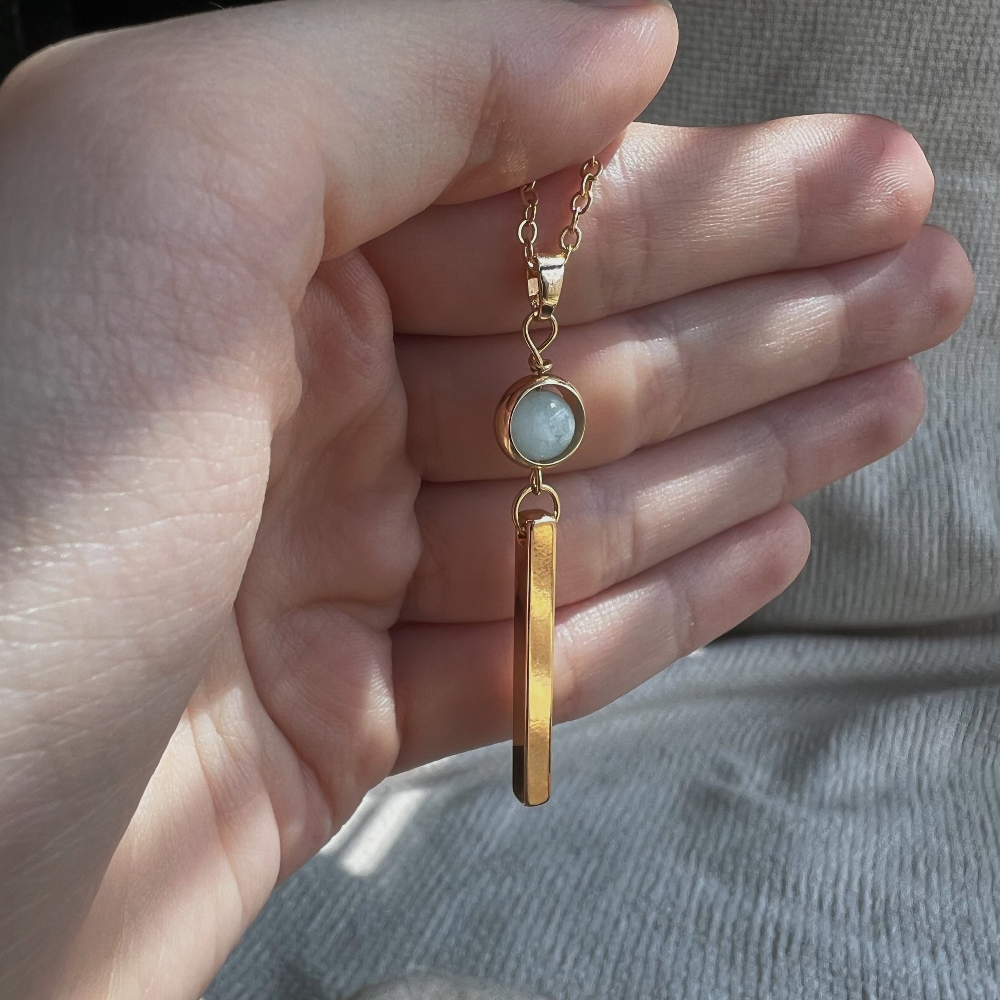 Dieser minimalistische Kettenanhänger mit Natursteinperlen aus Messing wurde liebevoll entworfen, um deine natürliche Eleganz zu unterstreichen. Seine schlichte Schönheit verleiht deinem Outfit das gewisse Etwas. Entdecke mit diesem zeitlosen Anhänger ein Accessoire, das deine Persönlichkeit auf sanfte Weise unterstreicht.