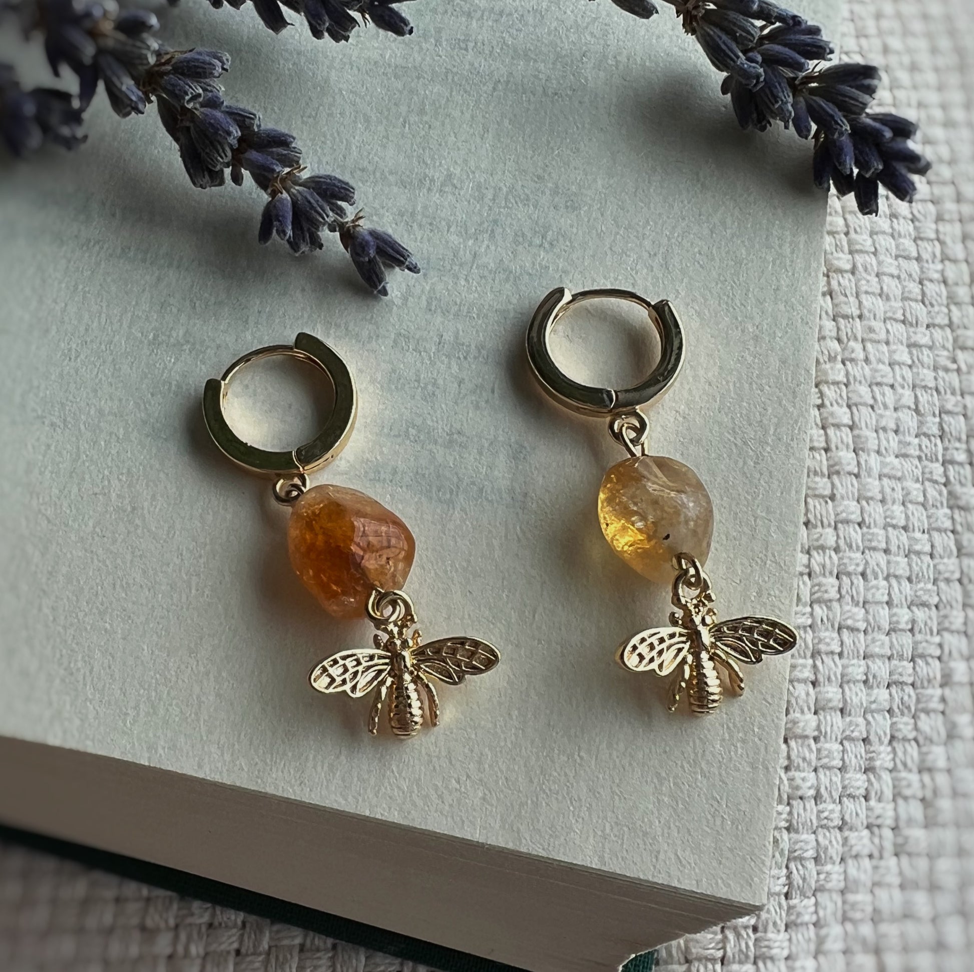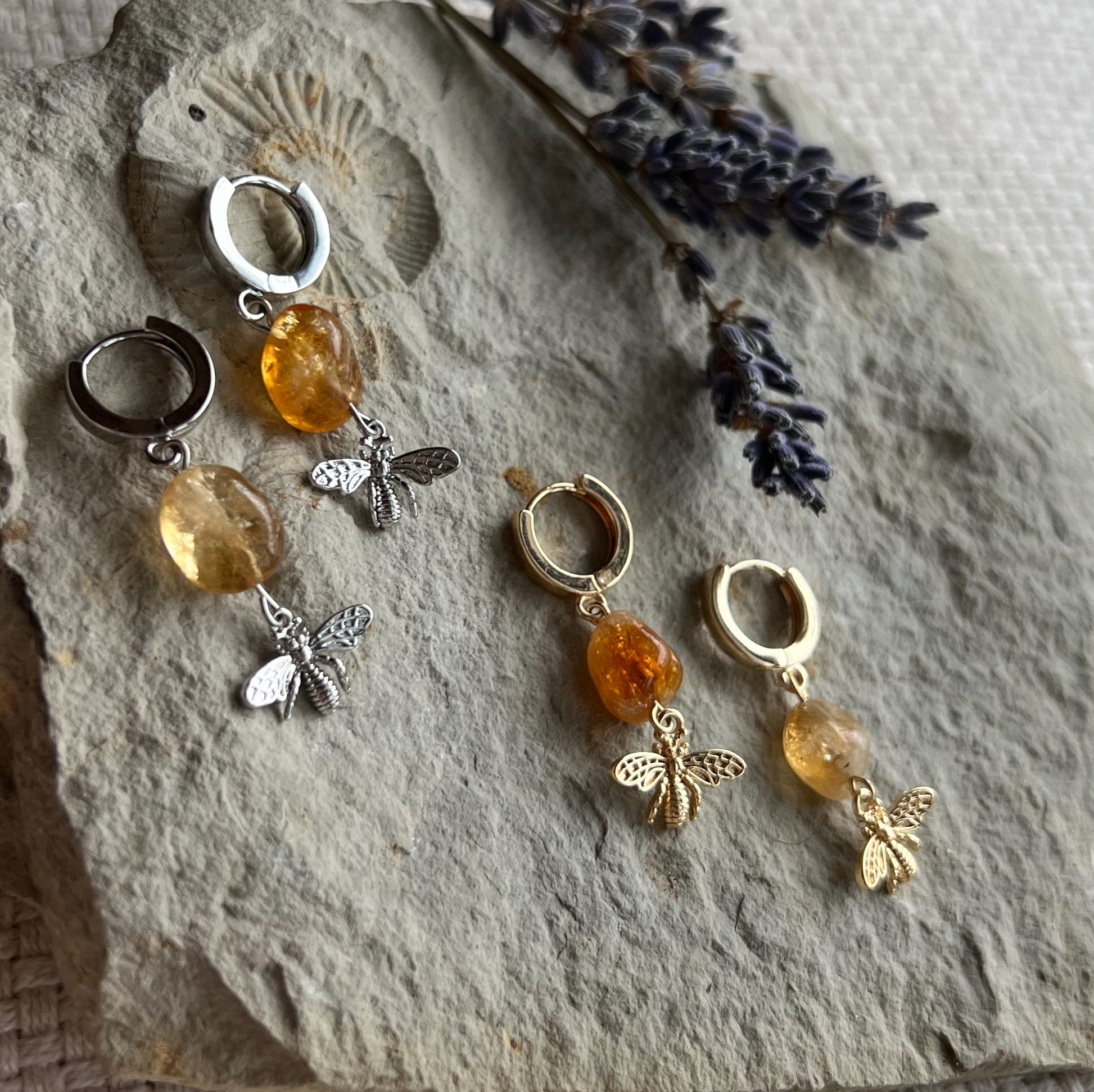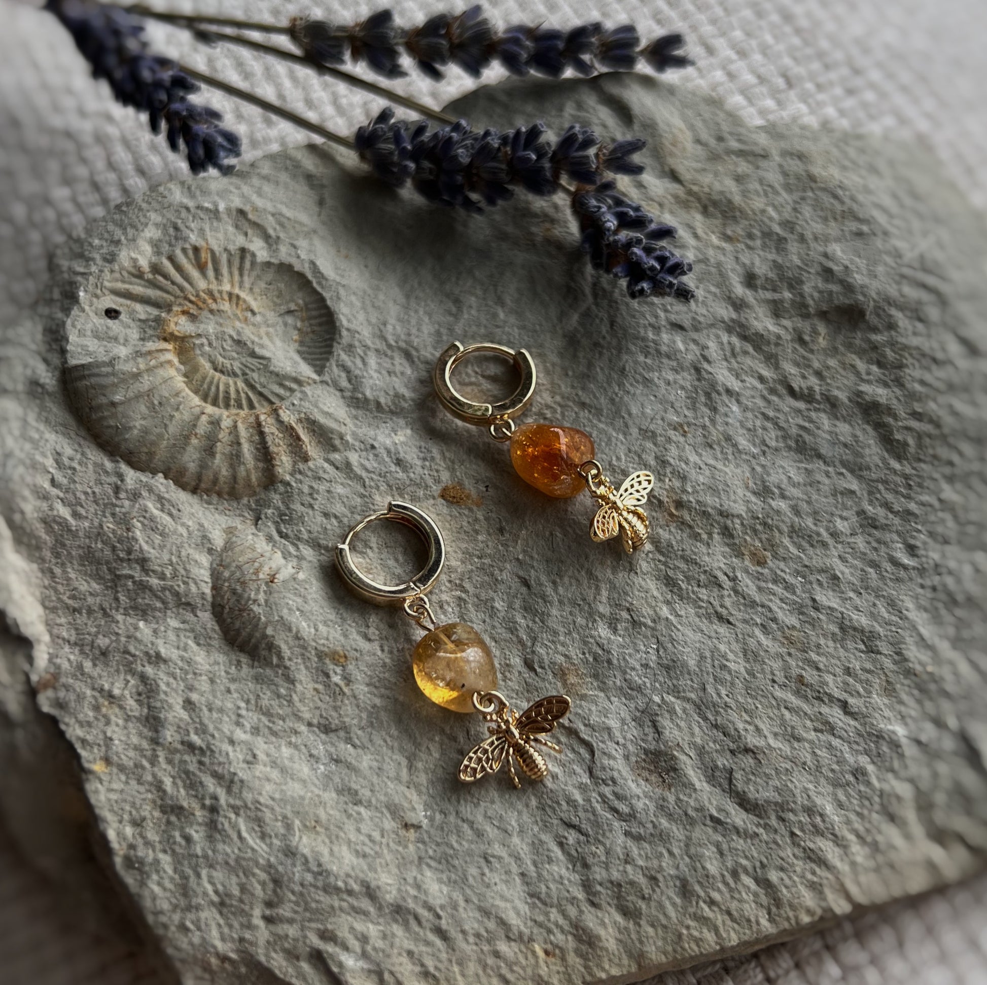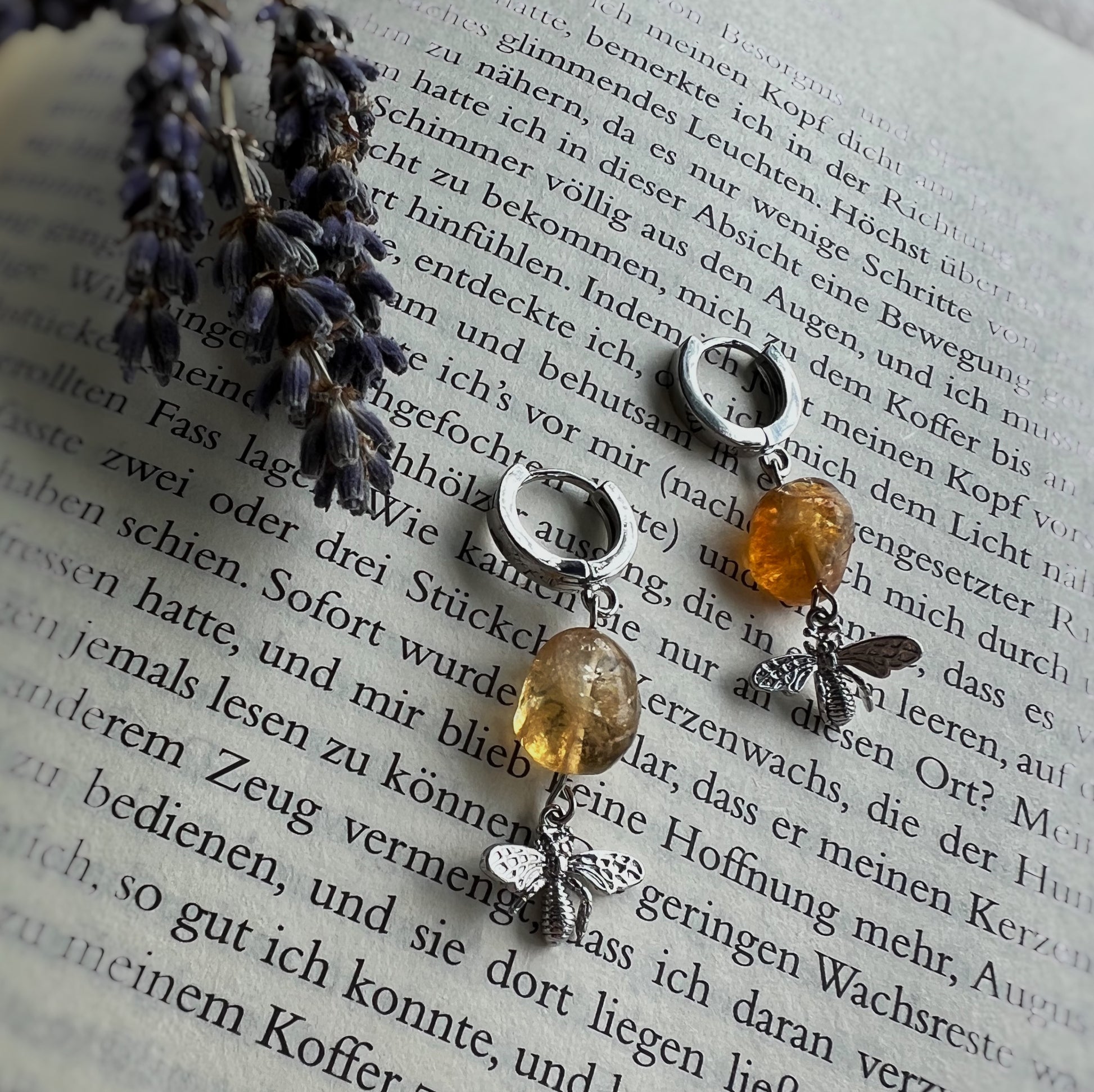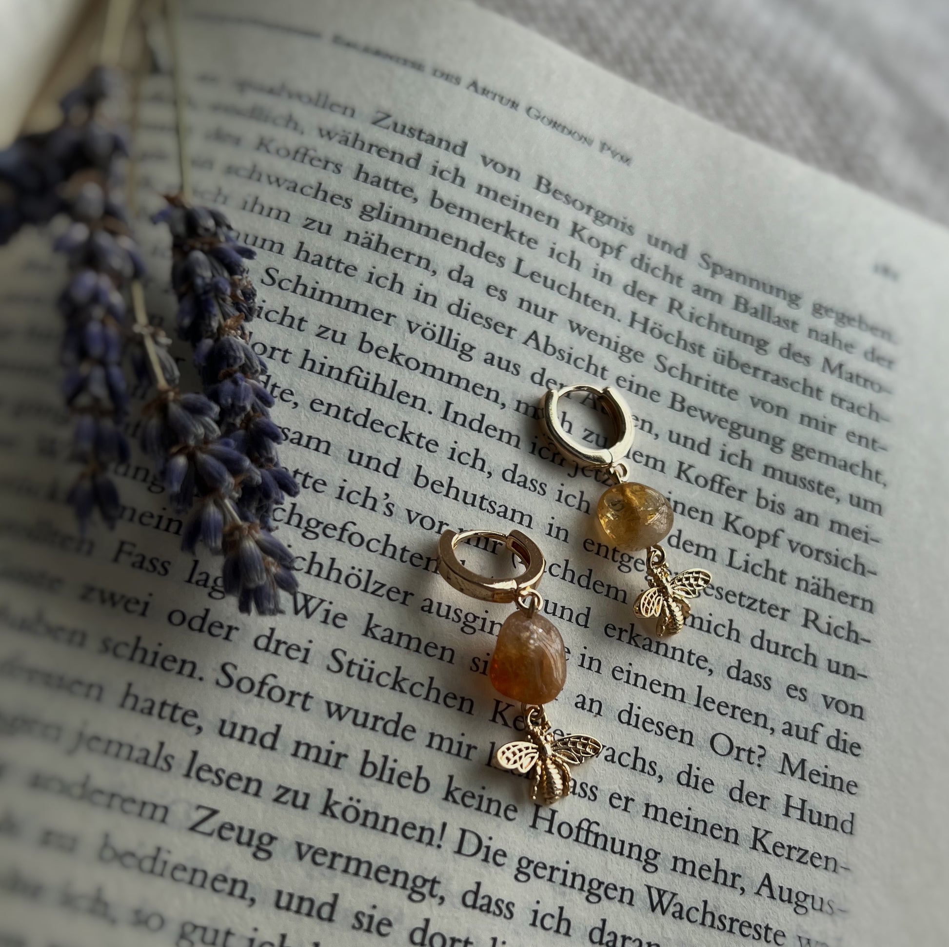 Diese kleinen Creolen sind wie ein Liebesbrief an die Natur, mit zarten Citrinanhängern, die den goldenen Glanz von Honig widerspiegeln, und bezaubernden Bienenanhängern. Der Citrin erinnert an die süße Fülle der Natur und die Bienenanhänger symbolisieren die unermüdliche Arbeit dieser faszinierenden Kreaturen. Handgefertigt mit Liebe zum Detail, sind sie ein elegantes Symbol für die zeitlose Schönheit und Bedeutung der Natur.