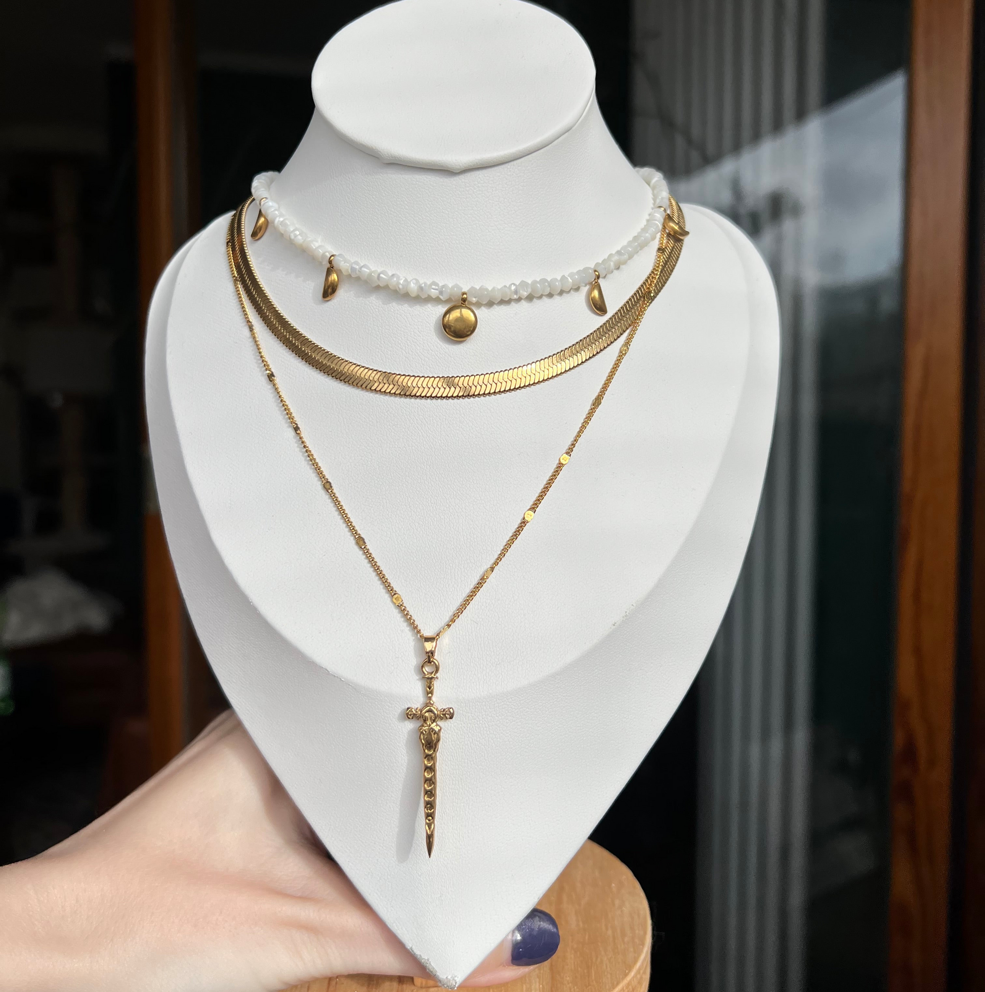 Eine feine Kette mit Schwertanhänger, eine glatte Schlangen-Halskette und eine Perlmuttkette mit kleinen Mondphasen-Anhängern.