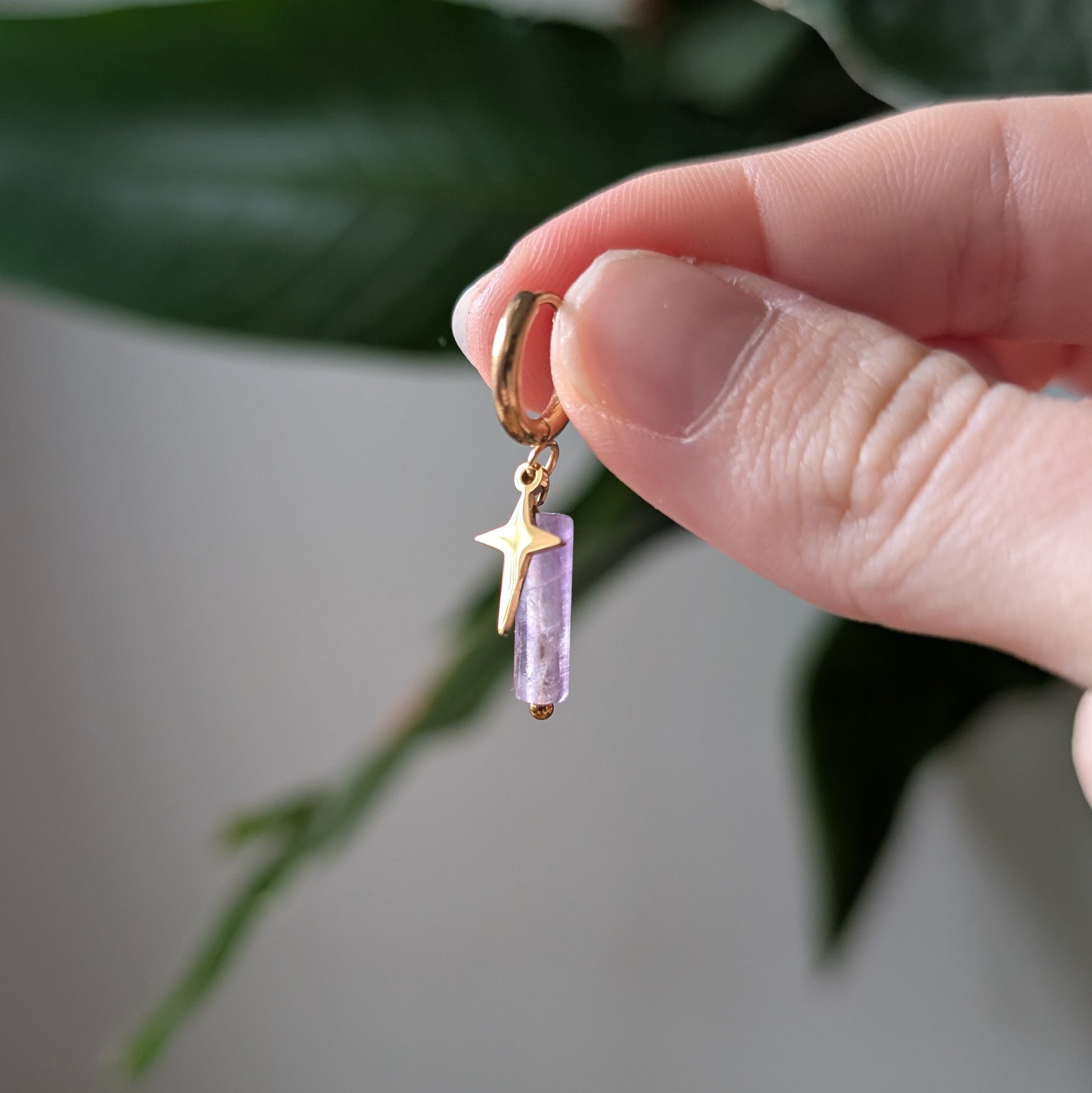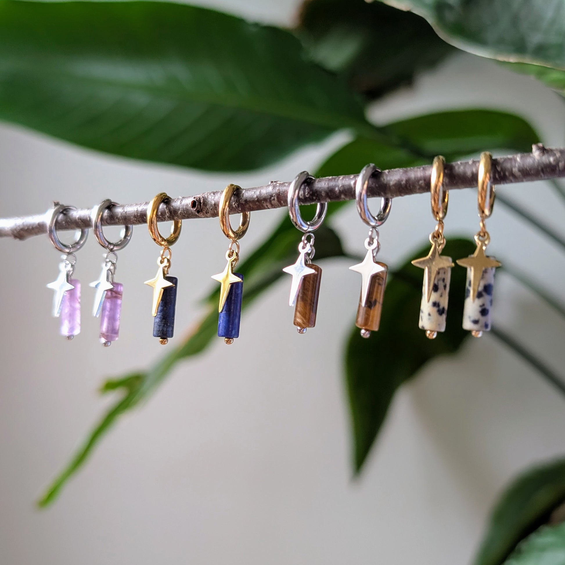 Mit diesen Ohrringen holst du dir den perfekten Mix aus Natur und einem Hauch von Sternenmagie zu dir nach Hause. Such dir deinen Lieblingsstein aus – ob Amethyst, Lapislazuli, Tigerauge oder Dalmatinerstein – und lass den goldenen oder silbernen Stern-Detail dein Outfit zum Funkeln bringen. Ideal, um deinem Look einen dezenten, mystischen Touch zu verleihen!