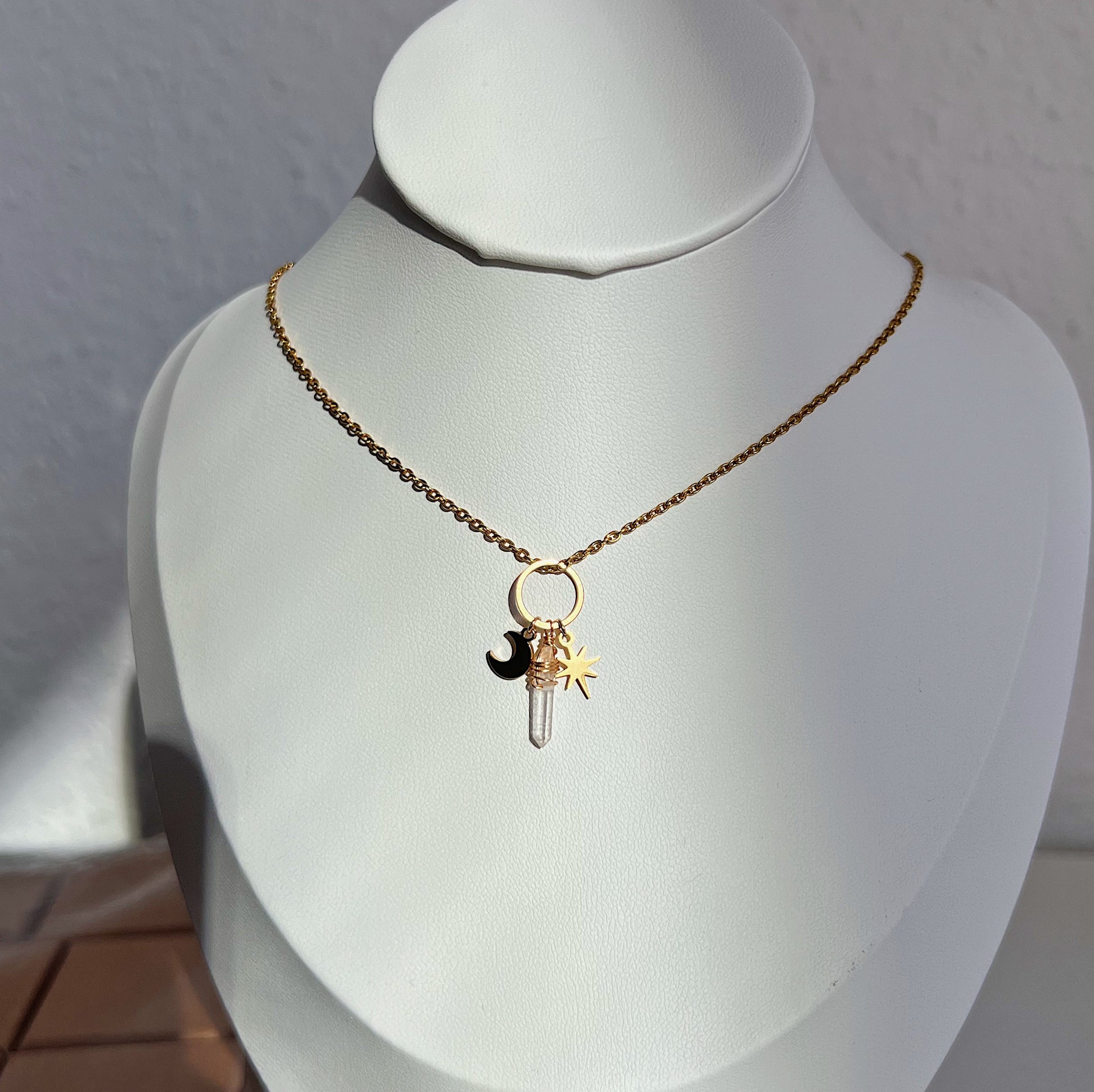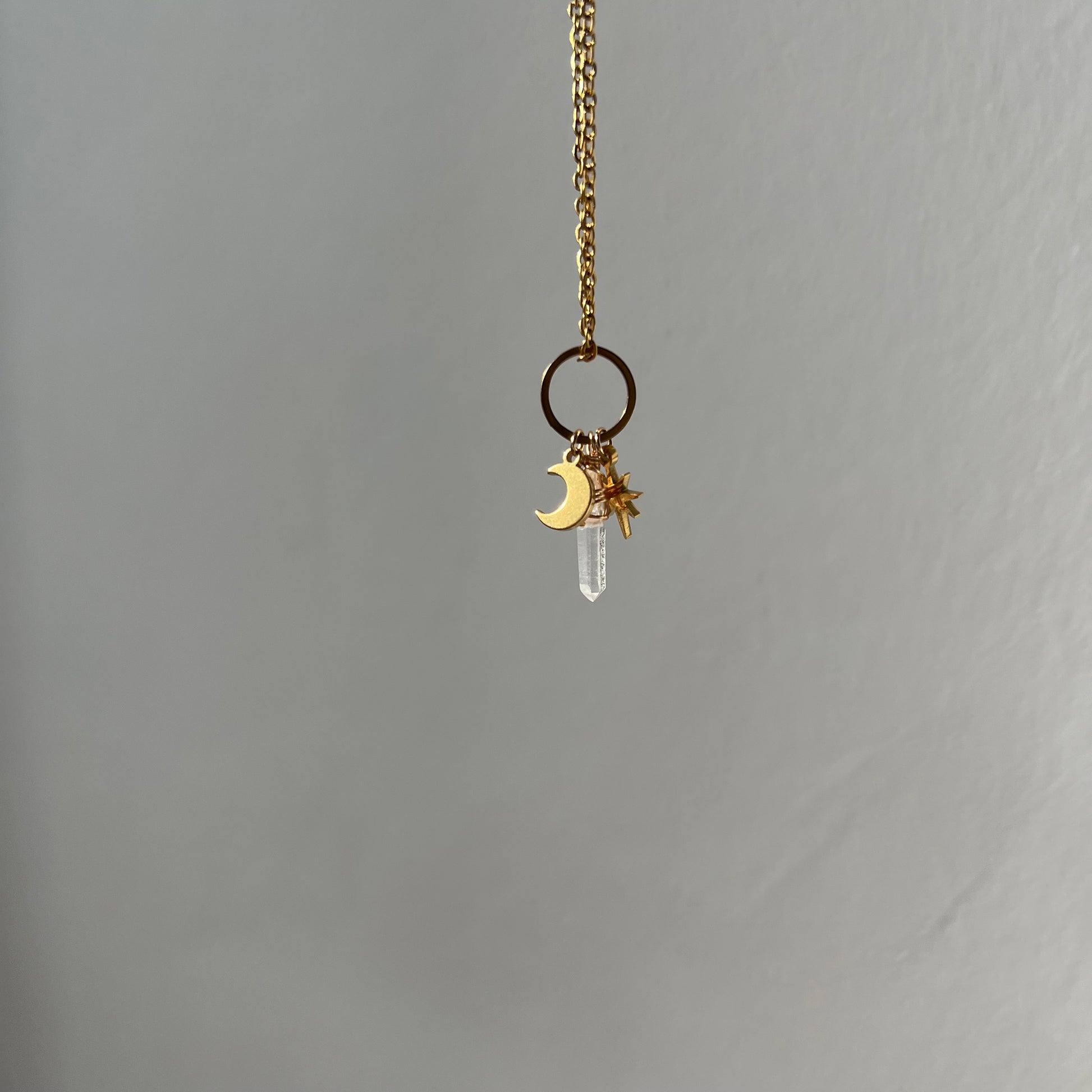 Dieser Kettenanhänger vereint himmlische und erdverbundene Elemente in einem einzigartigen Design: Ein filigraner Stern, ein sanft schimmernder Mond und ein klarer Bergkristall schmücken den zeitlosen Kettenanhänger. Der Stern steht für Hoffnung, der Mond für Intuition und der Bergkristall traditionell für Klarheit. Ein Schmuckstück, das die Magie des Universums einfängt und dich strahlen lässt.