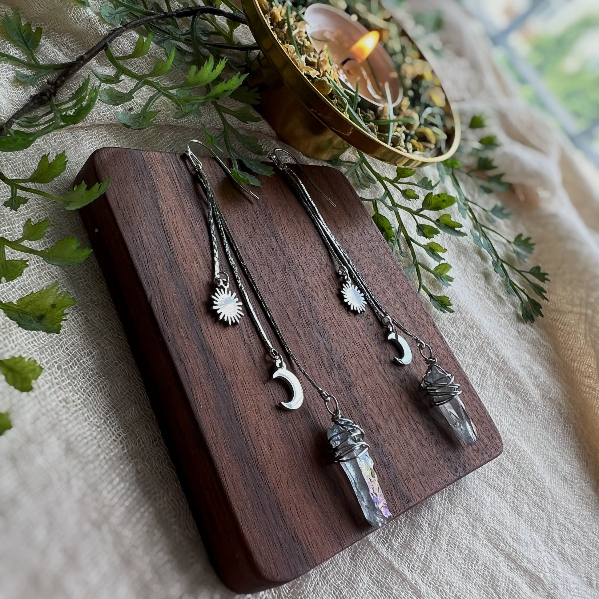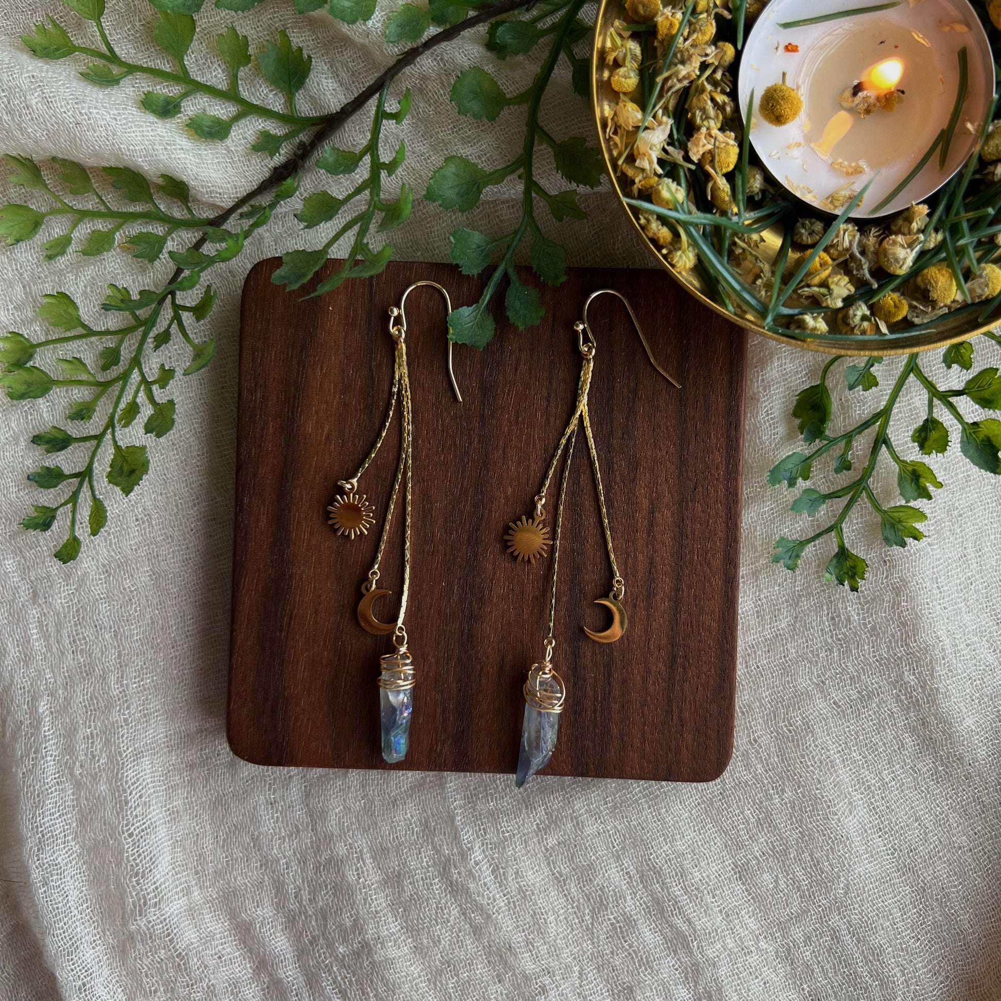 Diese Hängeohrringe aus Messing sind von der Schönheit des Himmels und der Erde inspiriert. Diese Ohrringe sind nicht nur ein Blickfang, sondern auch eine Erinnerung an die Schönheit und Mystik des Universums.