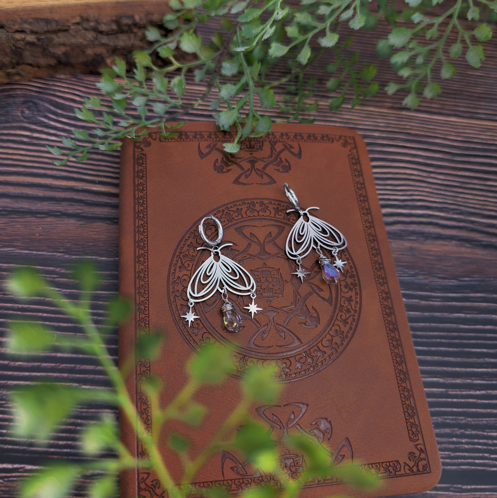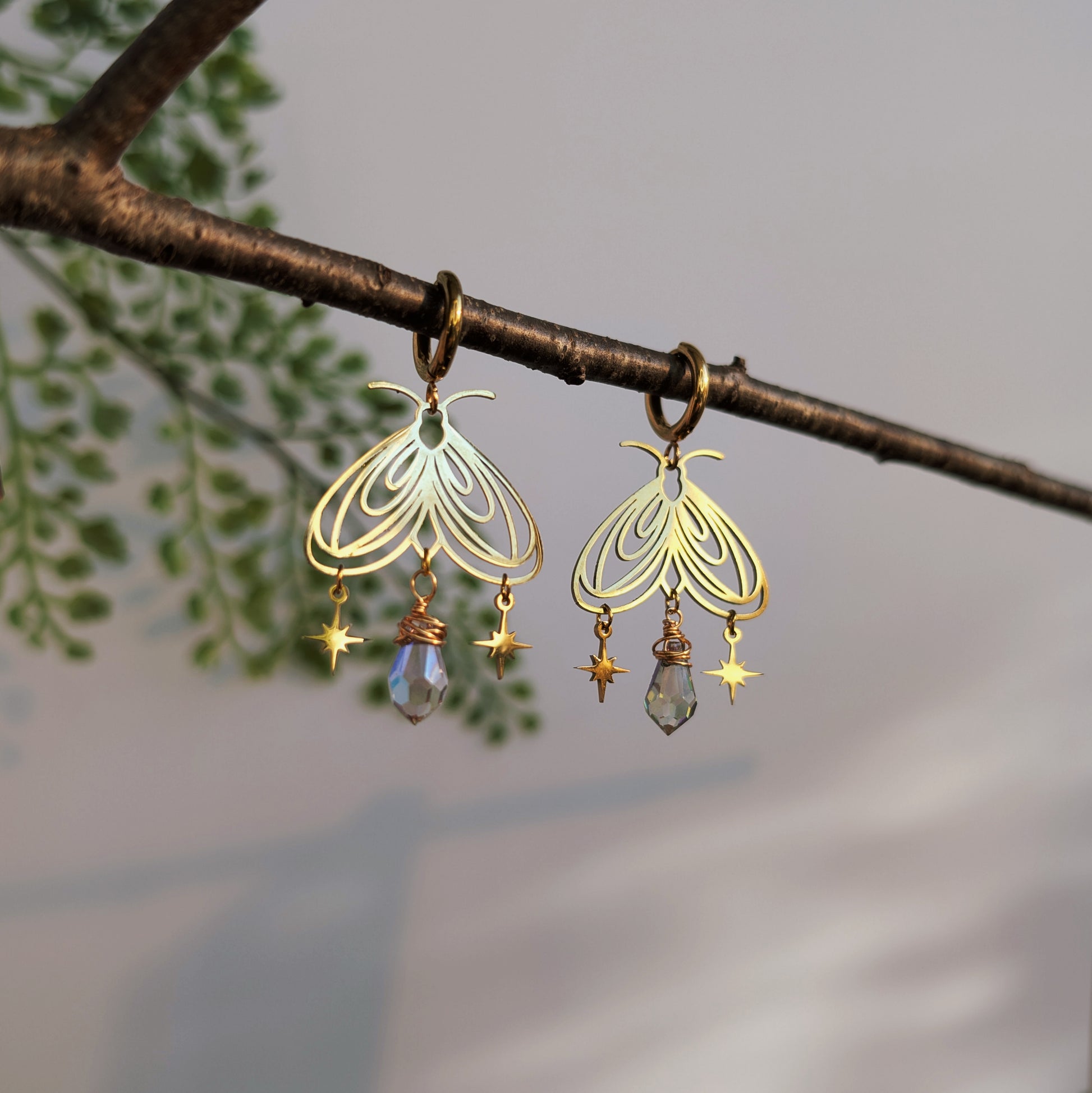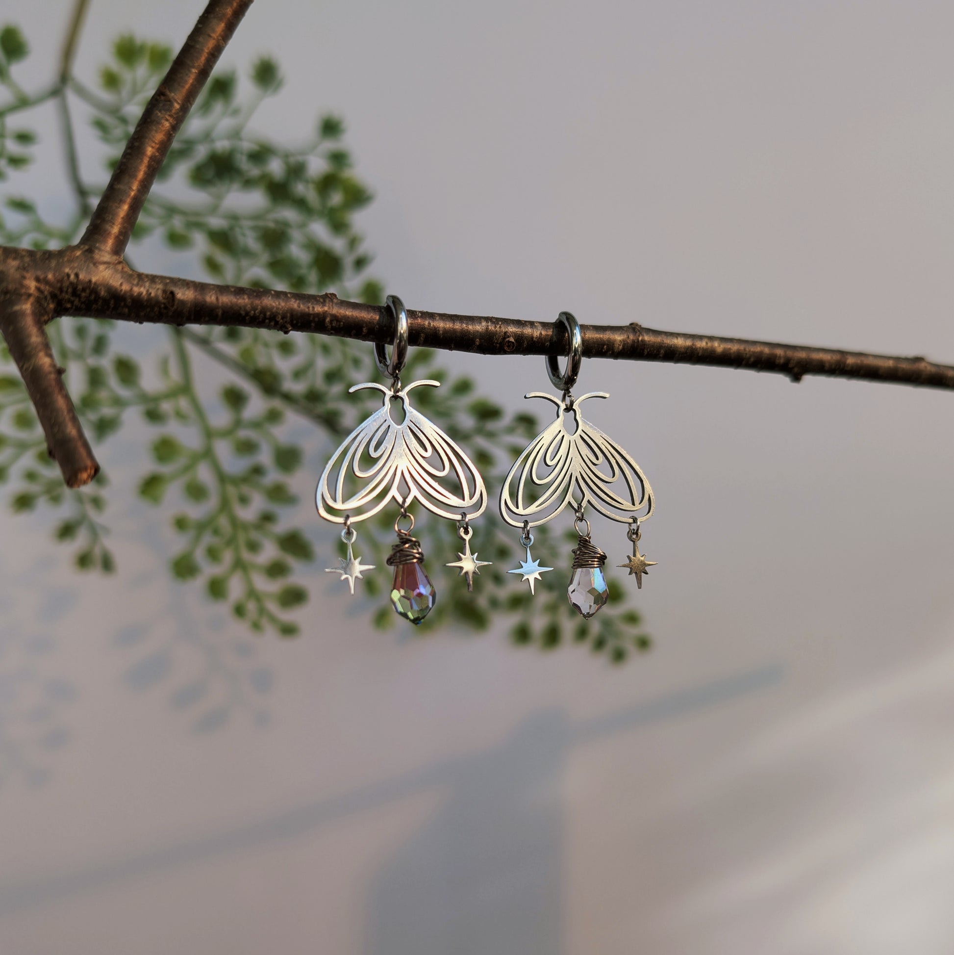 Zarte Mottenohrringe, die im Licht sanft schimmern. Die filigrane Form wird von einer kleinen Glasperle ergänzt, die wie ein Suncatcher glitzert. Zwei kleine Sterne bringen Bewegung und einen feinen, märchenhaften Akzent.