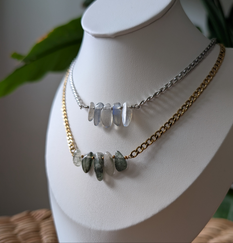 Jeder Stein ist einzigartig und wurde sorgfältig per Hand auf eine filigrane Gliederkette aufgereiht – wahlweise in Gold- oder Silberoptik.