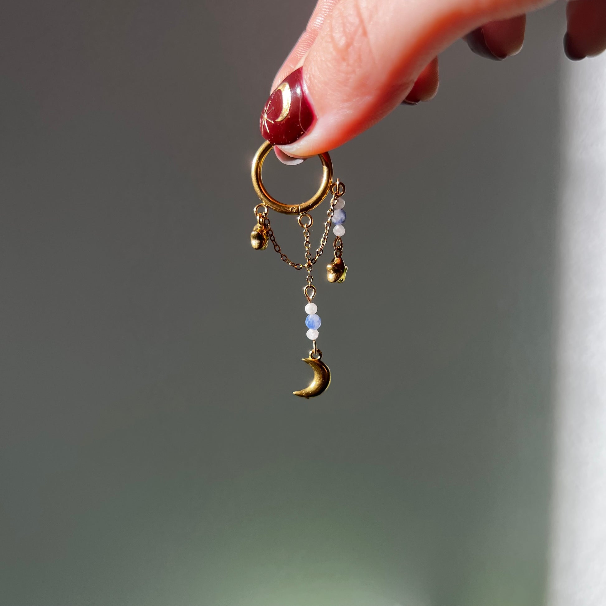 Creolen aus Edelstahl mit kleinen Anhängern aus Sodalith und Mondstein. Die sanften Blau- und Weißtöne treffen auf Mond- und Sternsymbole und erinnern an klare Nächte und leises Funkeln.